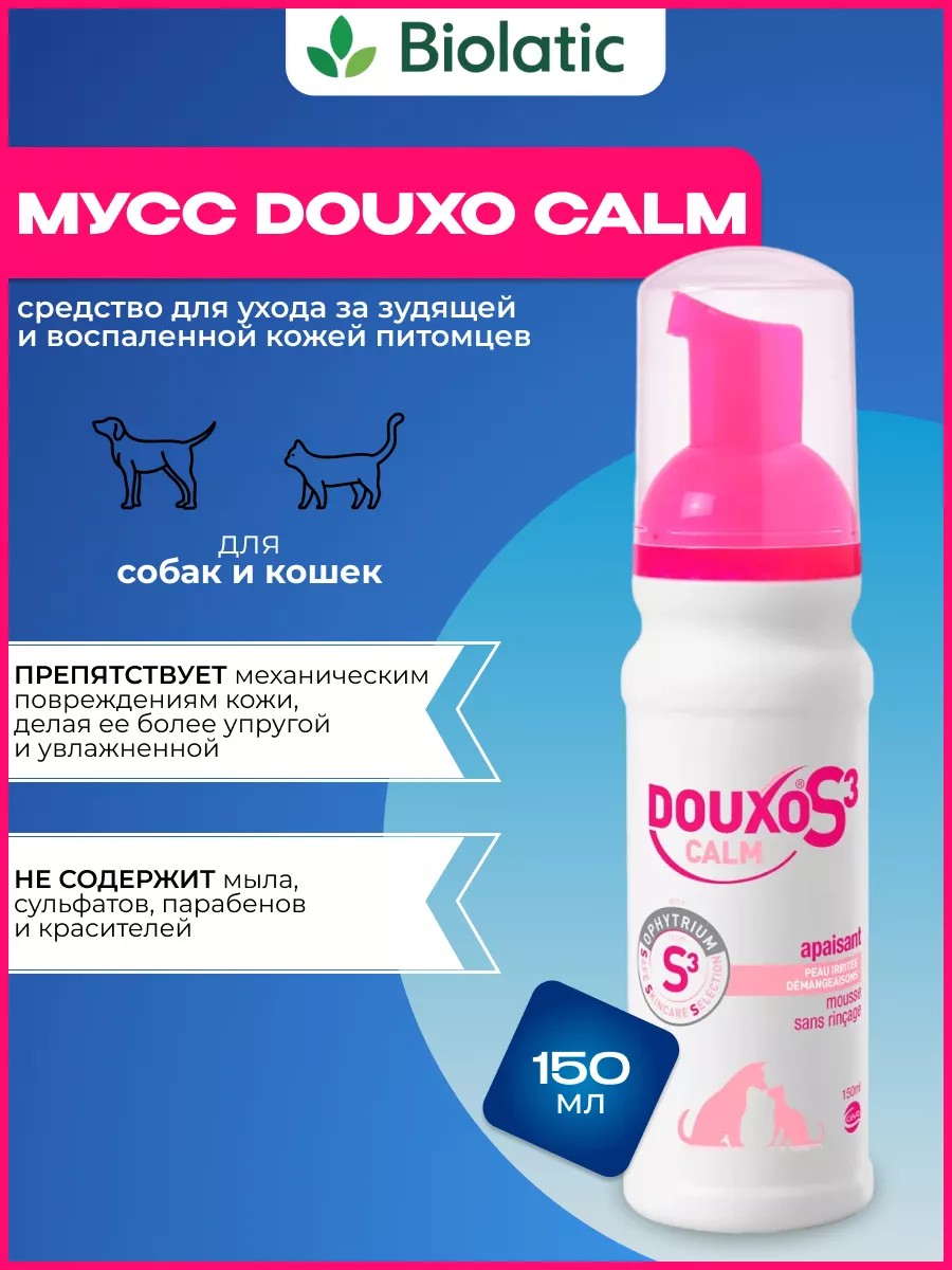 Зоогигиеническое моющее средство для собак и кошек. Без парабенов, красителей, наночастиц. Не требуется ополаскивание. Содержит гипоаллергенную и рН-сбалансированную парфюмерную композицию. Офитриум (Ophytrium), очищенный компонент натурального происхождения, действующий в трех направлениях S3 (Safe Skincare Selection) - безопасный выбор по уходу за кожей: укрепляет механический кожный барьер для упругости и длительного увлажнения кожи; нормализует естественную микрофлору кожи;успокаивает раздражённую кожу. Применение: ;концентрированный мусс предназначен для применения собакам и кошкам с чувствительной кожей, склонной к раздражению и зуду. Успокаивает, очищает и укрепляет кожный барьер, увлажняет и облегчает распутывание шерсти, делает шерсть мягкой и блестящей. Для достижения лучшего эффекта Дуксо S3 Кальм мусс рекомендуется применять попеременно с Дуксо.