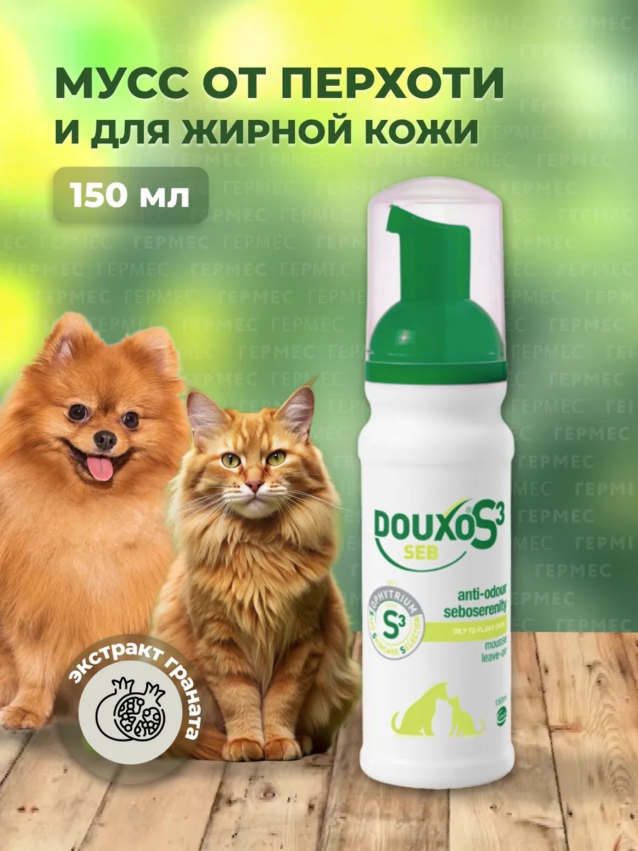 DOUXO S3 Seb, leave-in mousse for oily skin in dogs and cats, 150 ml bottle: Douxo S3 Seb for dogs and cats is a mousse from a new line of care products for skin prone to oiliness, dandruff, or flaking, and for coats that quickly become dirty and acquire a "rancid oil" smell. Ophitrium zoomousse is based on a unique natural ingredient extracted from the root of the Japanese lily of the valley. Ophitrium has been clinically proven to be highly tolerable in animals and has a triple action, restoring the skin barrier: Prevents mechanical damage to the skin, making it more elastic and hydrated Promotes the development and maintenance of the skin's protective balance Reduces irritation Douxo S3 Seb mousse also contains panthenol, vitamin PP, and pomegranate extract. Together, they enhance the restorative effect of the detergent, regulate sebum production, and promote easy detangling. Benefits of Douxo S3 Seb. Mousse.