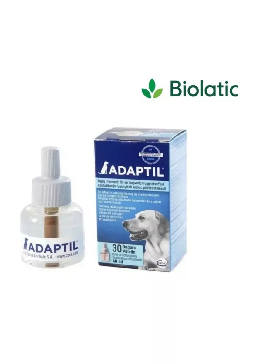 CEVA Adaptil (Ceva Adaptil) Pheromone for dogs to normalize behavior. Manufactured by CEVA Sante Animale (Ceva Sante Animale), France. Contains a structural analogue of the pheromone of a lactating bitch. PHARMACOLOGICAL PROPERTIES. By releasing a synthesized pheromone, which is a complete analogue of the pheromone of lactating bitches, "Adaptil pheromone for dogs" imitates the action of this pheromone, calming the dog and creating a feeling of peace and security in the animal. INDICATIONS. Adaptil restores well-being and normalizes the behavior of dogs in stressful situations. Recommended for early weaning of puppies from their mother and in various stressful situations for the dog: fear of noises and explosions (fireworks, thunderstorms, gunshots, etc.), separation from the owner (fear of loneliness, temporary separation), when a new family member appears, during and after a visit to the veterinarian, when visiting an exhibition, when transporting the animal. DOSAGE AND METHOD OF ADMINISTRATION Adaptil diffuser Remove the cap from the bottle. Insert the bottle into the diffuser and tighten until you feel slight resistance. Plug the assembled diffuser into an electrical outlet. Effective area: 50-70 m2 Adaptil spray Treat the dog's bedding 15 minutes before the expected event, repeat the treatment every 1.5-2 hours. NO CONTRAINDICATIONS RELEASE FORM Set: 1 diffuser + 1 bottle of 48 ml. Diffuser Replacement Bottle: 1 x 48ml
