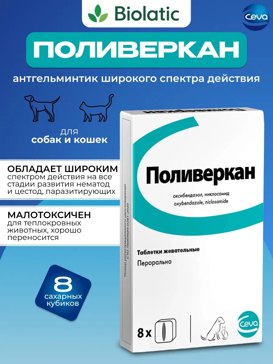 Polyvercan is used in dogs and cats for the prevention and treatment of toxocariasis, toxascariasis, uncinariasis, ancylostomiasis, dipylidiasis, diphyllobothriasis. The drug is prescribed orally in the following single doses: kittens and puppies weighing 0.5 kg - 1/4 briquette; cats and dogs weighing 1-5 kg - 1/2 briquette; dogs weighing 5-10 kg - 1 briquette; dogs weighing 10-20 kg - 2 briquettes; dogs weighing 20-30 kg - 3 briquettes; dogs weighing 30-40 kg - 4 briquettes; For dogs weighing 40-50 kg, 5 briquettes; for dogs weighing 50 kg and above, 6 briquettes. The maximum dose per animal is no more than six briquettes. For dogs, the sugar cube is fed from the owner's hand or added to food (water); for cats, it is added to food or, after dissolving the drug in a small amount of water, it is administered orally with a syringe. For therapeutic purposes, it is given twice with an interval of 10 days, for prophylactic purposes, it is given once per quarter.