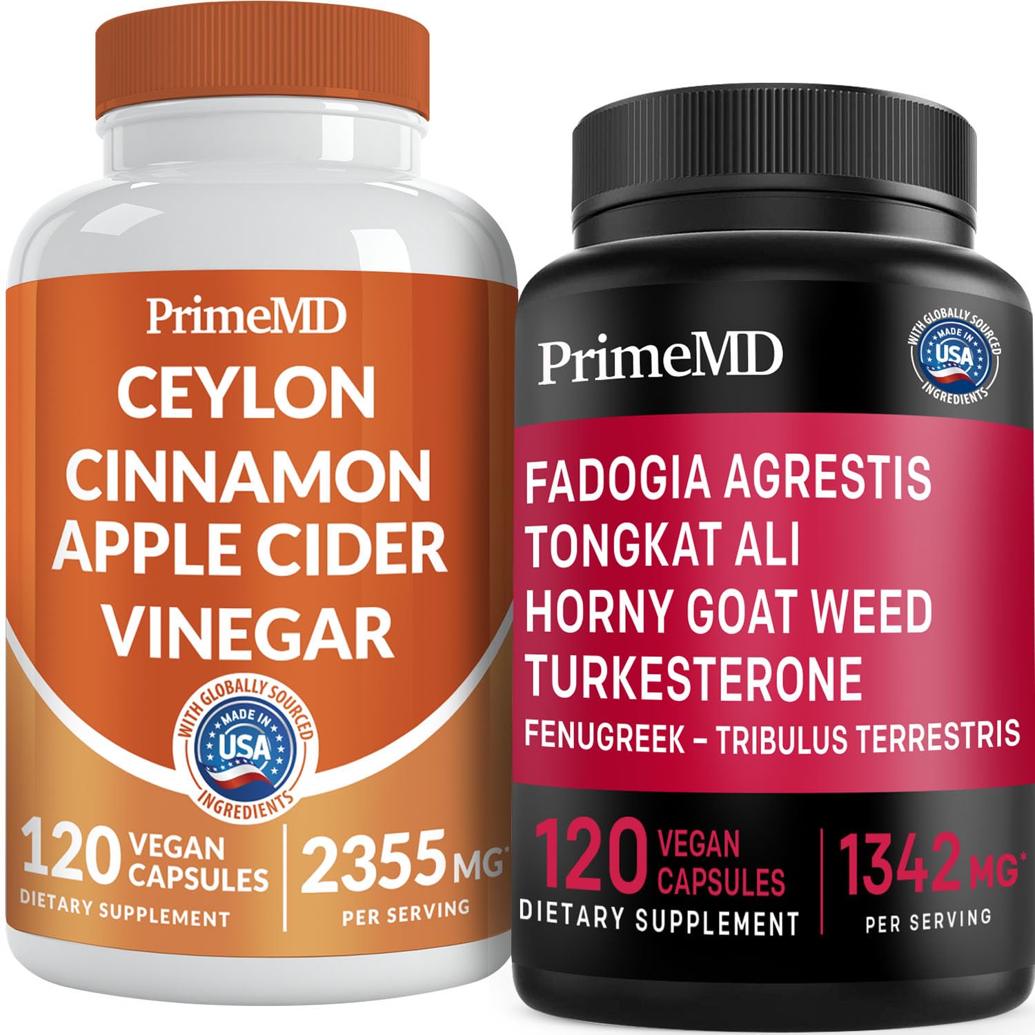 It's about time we realize the importance of self-love and investing in ourselves, inside and out. Get your daily dose of essential multivitamins with PrimeMD's holistic supplement duo: Ceylon Cinnamon Capsules and Fadogia Tongkat Ali Capsules. With a roster of carefully studied ingredients derived from nature, our 5-in-1 Ceylon Cinnamon complex, enriched with BioPerine, provides highly bioavailable nutrients for optimal functioning. Meanwhile, our 12-in-1 Fadogia Agrestis Tongkat Ali blend contains a synergy of 3 vitamins and minerals, and 9 herbal extracts that work together to support overall satisfaction and the kind of energy that lets you keep going, whether you're in the gym or the bedroom. Optimize your well-being today with this exceptional bundle of (1) bottle of Ceylon Cinnamon Capsules (120ct) and (1) bottle of Fadogia Tongkat Ali Capsules (120ct).