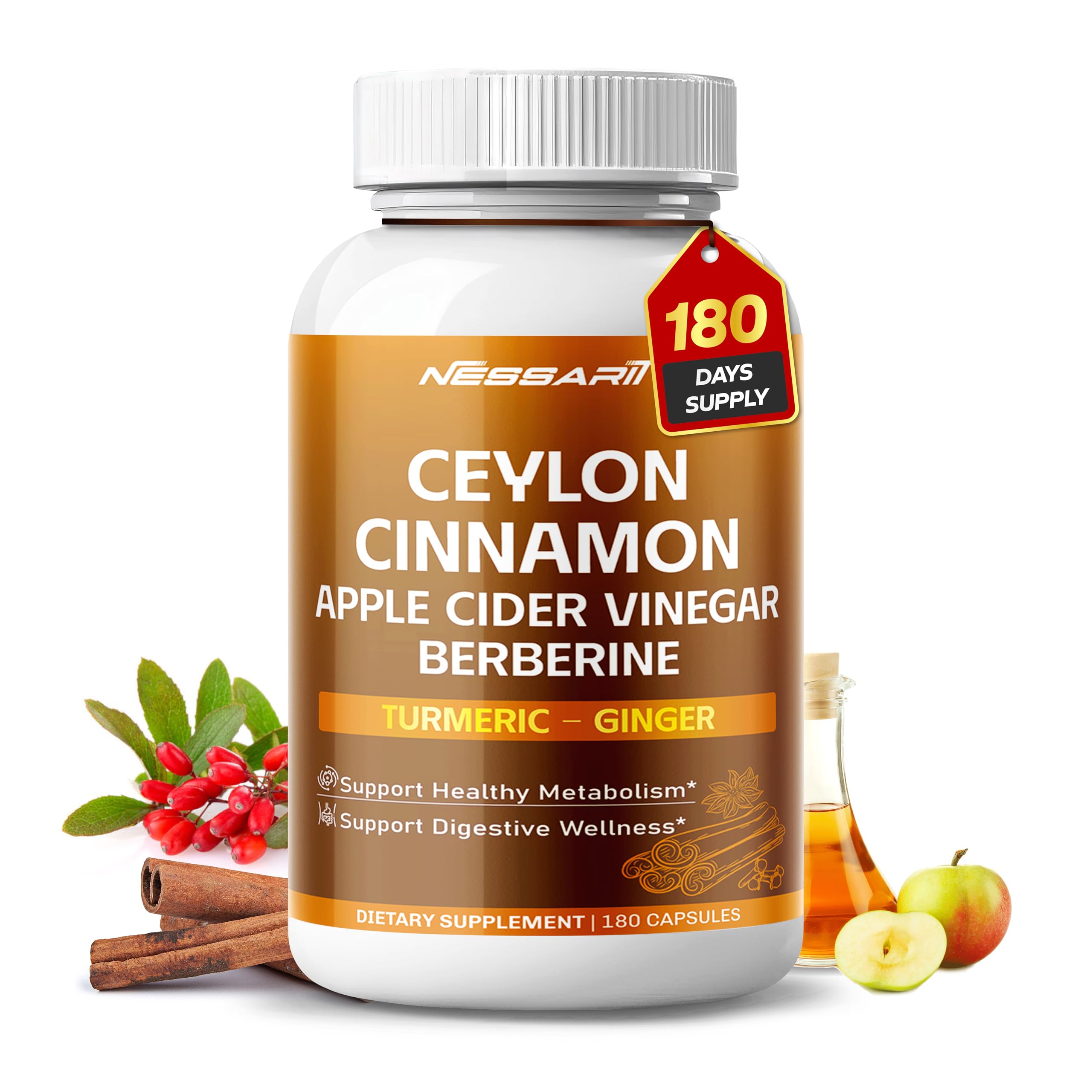 Ceylon Cinnamon Apple Cider Vinegar Berberine Turmeric & Ginger Support Metabolism & Digestion 180 Capsules 180 Count (pack of 1)