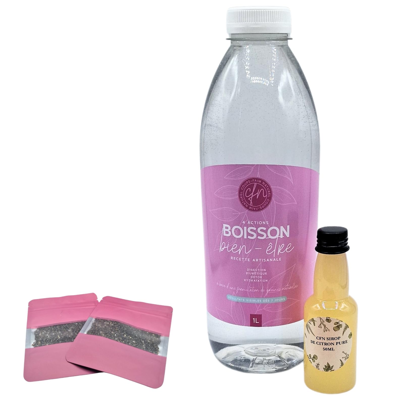 Improved Digestion and Natural Detoxification: Our wellness drink is formulated to improve digestion and promote the elimination of toxins accumulated in your body. Thanks to a powerful combination of fiber-rich ingredients, it reduces bloating and acts as a natural drainer, thus facilitating a flat stomach feeling and lasting digestive comfort. For an effective treatment, choose between 7, 14, or 30 days. INGREDIENTS Chia seeds, syrup100 Natural Formulation with No Chemical Additives: Developed in a laboratory in France, our wellness drink is made with ingredients such as chia and flax seeds, known for their digestive and regenerative properties. CFN syrups are available with or without sugar, for a personalized taste while respecting your health goals. Opt for a pure and natural solution that combines taste pleasure and health benefits, all in a tested and approved formula. Anti-Cellulite Effect and Smoother Silhouette: Fight water retention and reduce the appearance of cellulite with our wellness drink. Specially designed to promote a smooth and toned silhouette, it helps improve skin texture while promoting natural drainage. Perfect for anyone who wants to refine their body naturally while taking care of their overall well-being. Skin, Hair, and Nail Health: Enriched with antioxidants and moisturizing properties, our wellness drink promotes the radiance and health of skin, hair, and nails. It helps fight the signs of aging, reduces acne, and promotes firm, glowing skin. A true source of well-being to enhance your inner and outer beauty, without additives or chemicals. Daily Energy Boost and Vitality: Thanks to its content of essential vitamins and minerals, this drink revitalizes your body by increg energy and stamina. Whether before a workout or to stay active throughout the day, it supports your energy levels naturally. Ideal for people with a dynamic lifestyle or for athletes looking for better performance and optimized recovery. Improved Digestion and Natural Detoxification: Our wellness drink is formulated to improve digestion and promote the elimination of toxins accumulated in your body. Thanks to a powerful combination of fiber-rich ingredients, it reduces bloating and acts as a natural drainer, promoting a flat stomach and lasting digestive comfort. For an effective treatment, choose between 7, 14, or 30 days. Amélioration de la Digestion et Détoxification Naturelle : Notre boisson bien-être est formulée pour améliorer la digestion et favoriser l'élimination des toxines accumulées dans votre organisme. Grâce à une combinaison puissante d'ingrédients riches en fibres, elle réduit les ballonnements et agit comme un drainant naturel, facilitant ainsi une sensation de ventre plat et un confort digestif durable. Pour une cure efficace, choisissez entre 7, 14, ou 30 jours. INGRÉDIENTS Graines de chia, siropFormulation 100 Naturelle Sans Additifs Chimiques : Élaborée en laboratoire en France, notre boisson bien-être est composée d'ingrédients tels que les graines de chia et de lin, reconnus pour leurs vertus digestives et régénératrices. Les sirops CFN sont disponibles avec ou sans sucre, pour un goût personnalisé tout en respectant vos objectifs santé. Optez pour une solution pure et naturelle qui allie plaisir gustatif et bienfaits pour la santé, le tout dans une formule testée et approuvée. Effet Anti-Cellulite et Silhouette Plus Lisse : Combattez la rétention d'eau et réduisez l'apparence de la cellulite grâce à notre boisson bien-être. Spécialement conçue pour favoriser une silhouette lisse et tonique, elle contribue à améliorer la texture de la peau tout en favorisant un drainage naturel. Parfaite pour toutes celles et ceux qui veulent affiner leur corps de façon naturelle tout en prenant soin de leur bien-être général. Santé de la Peau, des Cheveux et des Ongles : Enrichie en antioxydants et en propriétés hydratantes, notre boisson bien-être agit sur l'éclat et la santé de la peau, des cheveux, et des ongles. Elle aide à combattre les signes du vieillissement, réduit l'acné, et favorise une peau ferme et éclatante. Une vraie source de bien-être pour renforcer votre beauté intérieure et extérieure, sans additifs ni produits chimiques. Boost d'Énergie et Vitalité Quotidienne : Grâce à sa teneur en vitamines et minéraux essentiels, cette boisson revitalise votre corps en augmentant l'énergie et l'endurance. Que ce soit avant une séance de sport ou pour rester actif tout au long de la journée, elle soutient vos niveaux d'énergie de manière naturelle. Idéale pour les personnes ayant un mode de vie dynamique ou pour les sportifs à la recherche de meilleures performances et d'une récupération optimisée. Amélioration de la Digestion et Détoxification Naturelle : Notre boisson bien-être est formulée pour améliorer la digestion et favoriser l'élimination des toxines accumulées dans votre organisme. Grâce à une combinaison puissante d'ingrédients riches en fibres, elle réduit les ballonnements et agit comme un drainant naturel, facilitant ainsi une sensation de ventre plat et un confort digestif durable. Pour une cure efficace, choisissez entre 7, 14, ou 30 jours.