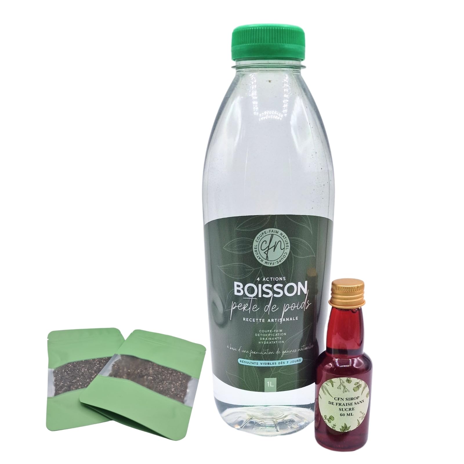 NATURAL WEIGHT LOSS FAT BURNER: Enjoy healthy weight loss with our drink made with natural and powerful ingredients. Formulated to promote digestion, burn fat, and contribute to a flat stomach, it is ideal for anyone wishing to improve their well-being without chemicals or artificial additives. Available in flexible formats: 7, 14 or 30 days. INGREDIENTS Chia seeds, syrupNATURAL AND ADDITIVE-FREE FORMULATION: Made from chia seeds (Salvia hispanica) and natural CFN syrups, our drink is laboratory tested and approved in France. Enjoy a refreshing and effective taste experience, with no added sugar (syrup of your choice) and without compromising on quality. A safe drink for pregnant or breastfeeding women, and ideal for anyone who wants to take care of their health naturally. ENERGY SUPPORT AND SPORTS PERFORMANCE: Our detox drink also acts as a natural energy booster. It improves your endurance, making it an ideal supplement before, during, or after your workouts. Perfect for athletes looking to combine performance and weight management, while staying hydrated in a healthy way. IMPROVES DIGESTION AND REDUCES BLOATING: With its natural fiber content and soothing properties, our drink helps improve digestion, reduces bloating, and contributes to a flatter stomach. Enjoy a feeling of lightness and better assimilation of nutrients for increased overall well-being every day. DETOX EFFECT AND APPETITE REGULATION: This slimming drink is your ally to purify the body and reduce cravings for snacking. Thanks to its diuretic and appetite suppressant properties, it eliminates toxins while helping you control your appetite. Say goodbye to cravings and find a balanced diet naturally, without gastric pain or discomfort. NATURAL WEIGHT LOSS FAT BURNER: Enjoy healthy weight loss with our drink made from natural and powerful ingredients. Formulated to promote digestion, burn fat, and contribute to a flat stomach, it is ideal for anyone wishing to improve their well-being without chemicals or artificial additives. Treatment available in flexible formats: 7, 14 or 30 days. PERTE DE POIDS NATURELLE BRULE-GRAISSE : Profitez d'une perte de poids saine avec notre boisson élaborée à partir d'ingrédients naturels et puissants. Formulée pour favoriser la digestion, brûler les graisses, et contribuer à un ventre plat, elle est idéale pour toute personne souhaitant améliorer son bien-être sans produits chimiques ou additifs artificiels. Cure disponible en formats flexibles : 7, 14 ou 30 jours. INGRÉDIENTS Graines de chia, siropFORMULATION NATURELLE ET SANS ADDITIFS : Elaborée à partir de graines de chia (Salvia hispanica) et de sirops CFN naturels, notre boisson est testée et approuvée en laboratoire en France. Profitez d'une expérience gustative rafraîchissante et efficace, sans sucre ajouté (sirop au choix) et sans compromis sur la qualité. Une boisson sûre pour les femmes enceintes ou allaitantes, et idéale pour tous ceux qui veulent prendre soin de leur santé de manière naturelle. SOUTIEN A L'ÉNERGIE ET PERFORMANCE SPORTIVE : Notre boisson détox agit également comme un booster d'énergie naturel. Elle améliore votre endurance, ce qui en fait un complément idéal avant, pendant ou après vos entraînements. Convient parfaitement aux sportifs cherchant à allier performance et gestion de poids, tout en restant hydraté de manière saine. AMELIORATION DE LA DIGESTION ET REDUCTION DES BALLONNEMENTS : Avec sa teneur en fibres naturelles et ses propriétés apaisantes, notre boisson aide à améliorer la digestion, réduit les ballonnements et contribue à un ventre plus plat. Profitez d'une sensation de légèreté et d'une meilleure assimilation des nutriments pour un bien-être général accru au quotidien. EFFET DETOX ET REGULATION DE L'APPETIT : Cette boisson minceur est votre alliée pour purifier l'organisme et réduire les envies de grignotage. Grâce à ses propriétés diurétiques et coupe-faim, elle élimine les toxines tout en vous aidant à contrôler votre appétit. Dites adieu aux fringales et retrouvez un équilibre alimentaire naturellement, sans douleurs ni gênes gastriques. PERTE DE POIDS NATURELLE BRULE-GRAISSE : Profitez d'une perte de poids saine avec notre boisson élaborée à partir d'ingrédients naturels et puissants. Formulée pour favoriser la digestion, brûler les graisses, et contribuer à un ventre plat, elle est idéale pour toute personne souhaitant améliorer son bien-être sans produits chimiques ou additifs artificiels. Cure disponible en formats flexibles : 7, 14 ou 30 jours.