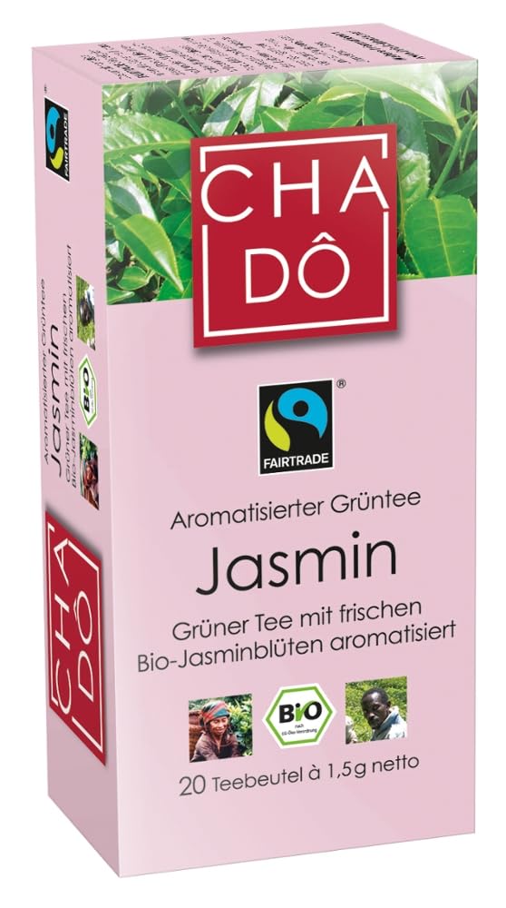 German organic certification fair trade label. INGREDIENTS Green tea, fresh jasmine flower flavor INSTRUCTIONS FOR USE Steep the bag in boiling water for 3 minutes. Let it cool. One bag is suitable for up to 250 ml of water. SAFETY WARNING Allergy information: No allergens (without testing): cereals containing gluten, wheat, spelt, rye, barley, oats, other cereals containing gluten, crustaceans, eggs, fish, peanuts, soy, milk, lactose, tree nuts, almonds, hazelnuts, walnuts, cashews, pecans, Brazil nuts, pistachios, macadamia nuts, celery, mustard, sesame, sulfites, lupin, molluscs See moreCha Dô Sachet de thé bio issu du commerce équitable Jasmin 20 x 1,5 g (1 x 30 g)DESCRIPTION DU PRODUIT DESCRIPTION DU PRODUIT Certification label biologique allemand issu du commerce équitable. INGRÉDIENTS Thé vert, arôme de fleurs de jasmin fraîches MODE D'EMPLOI Faire bouillir le sac avec de l'eau bouillante pendant 3 minutes. Laisser. Un sachet convient pour jusqu'à 250 ml d'eau. AVERTISSEMENT DE SÉCURITÉ Informations sur les allergies : non (sans analyse) : céréales contenant du gluten, blé, épeautre, seigle, orge, avoine, autres céréales contenant du gluten, crustacés, œufs, poisson, arachides, soja, lait, lactose, fruits à coque, amandes, noisettes, noix, noix de cajou, noix de pécan, noix du Brésil, pistache en, Macadamiane. noix, céleri, moutarde, sésame, sulfite, lupin, mollusques Voir plus