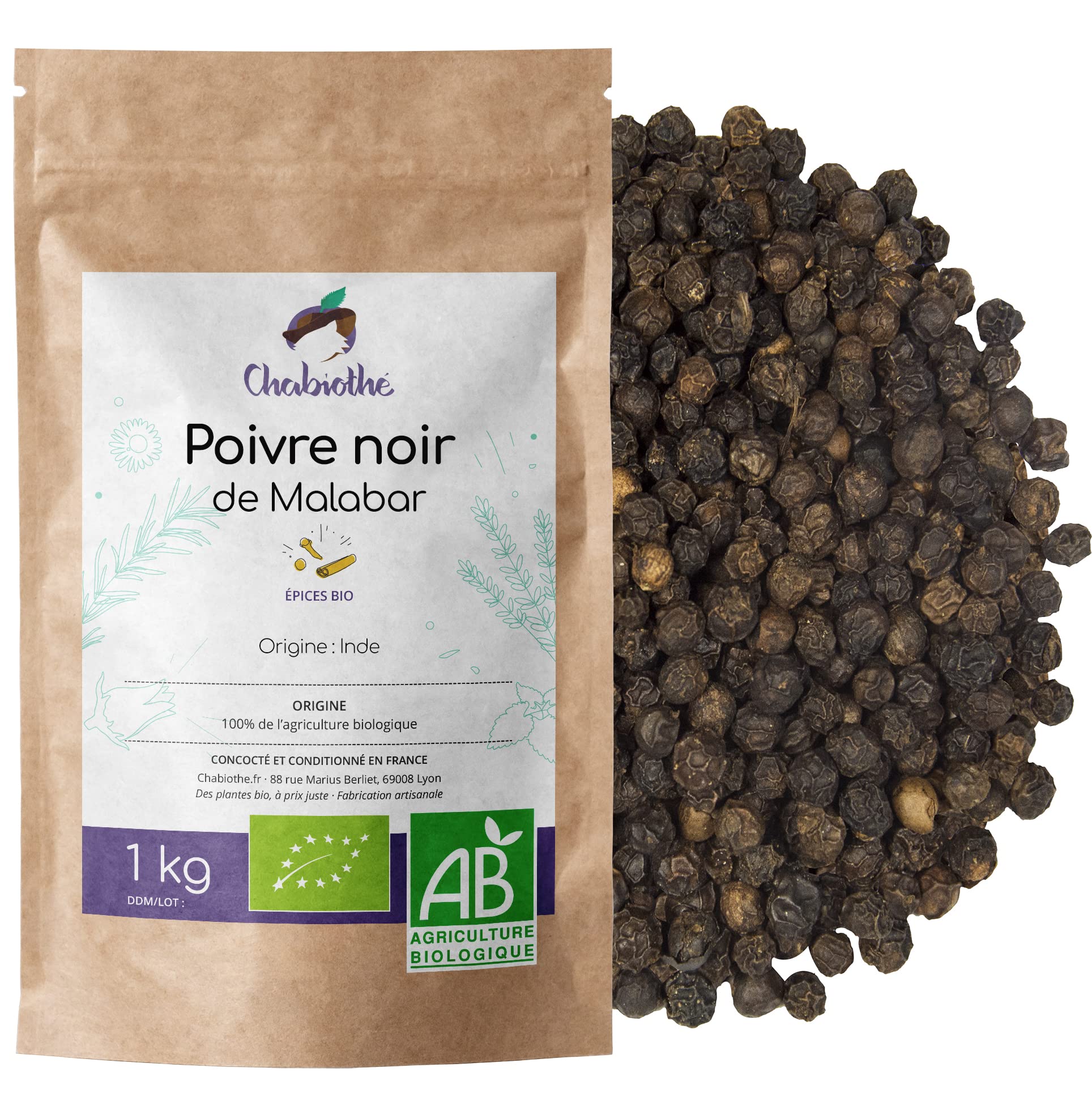 Chabiothé - Poivre noir BIO 1 kg - Malabar, Inde - épice grains entiers