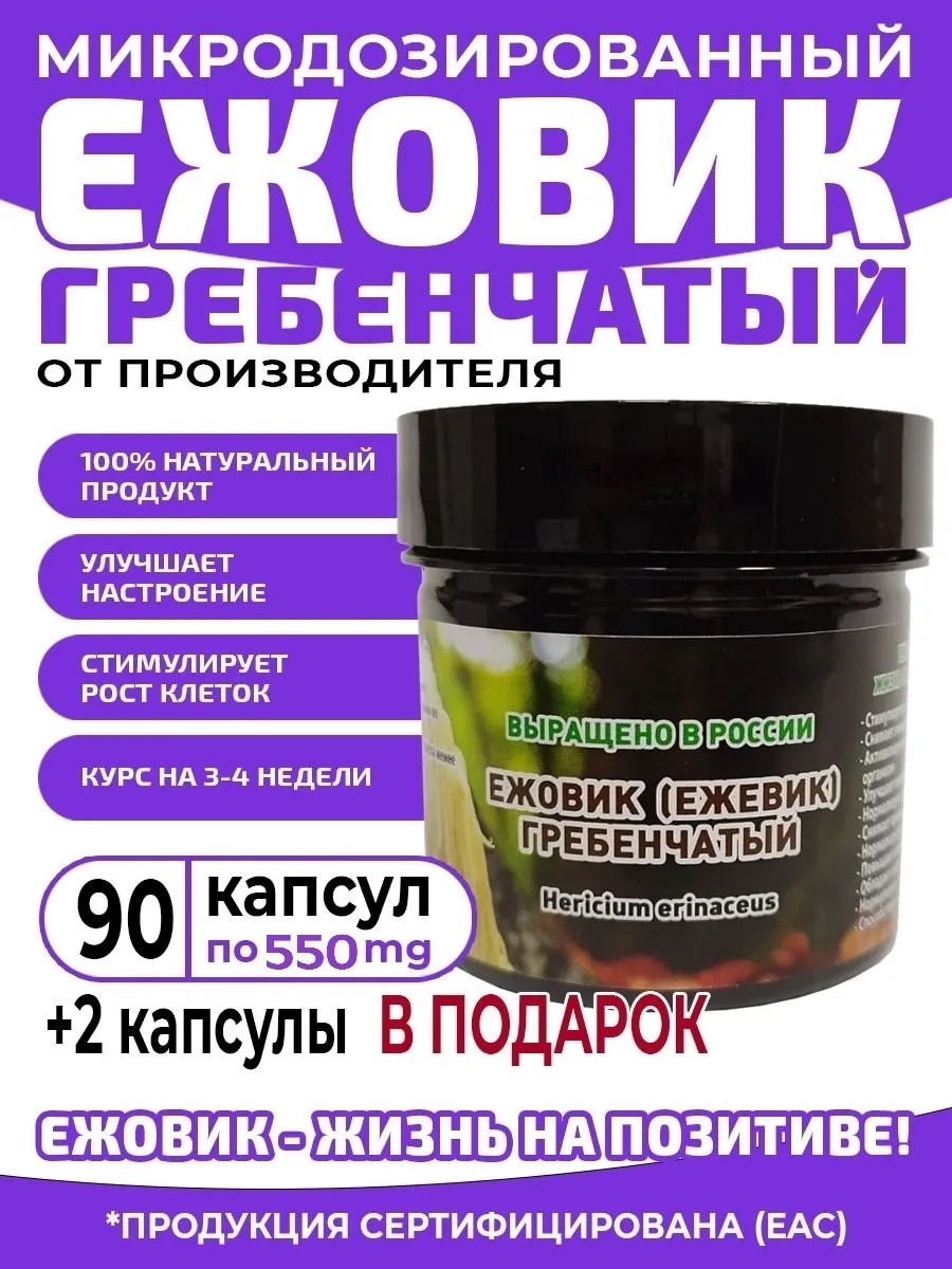 Ежовик или ежевик гребенчатый - лат. Hericium erinaceus, другие названия-герициум, львиная грива и др. Выращен в России! Микромолотый порошок ежовика в 90 капсулах по 550 мг + 2 капсулы в подарок! Ежовик-жизнь на позитиве!