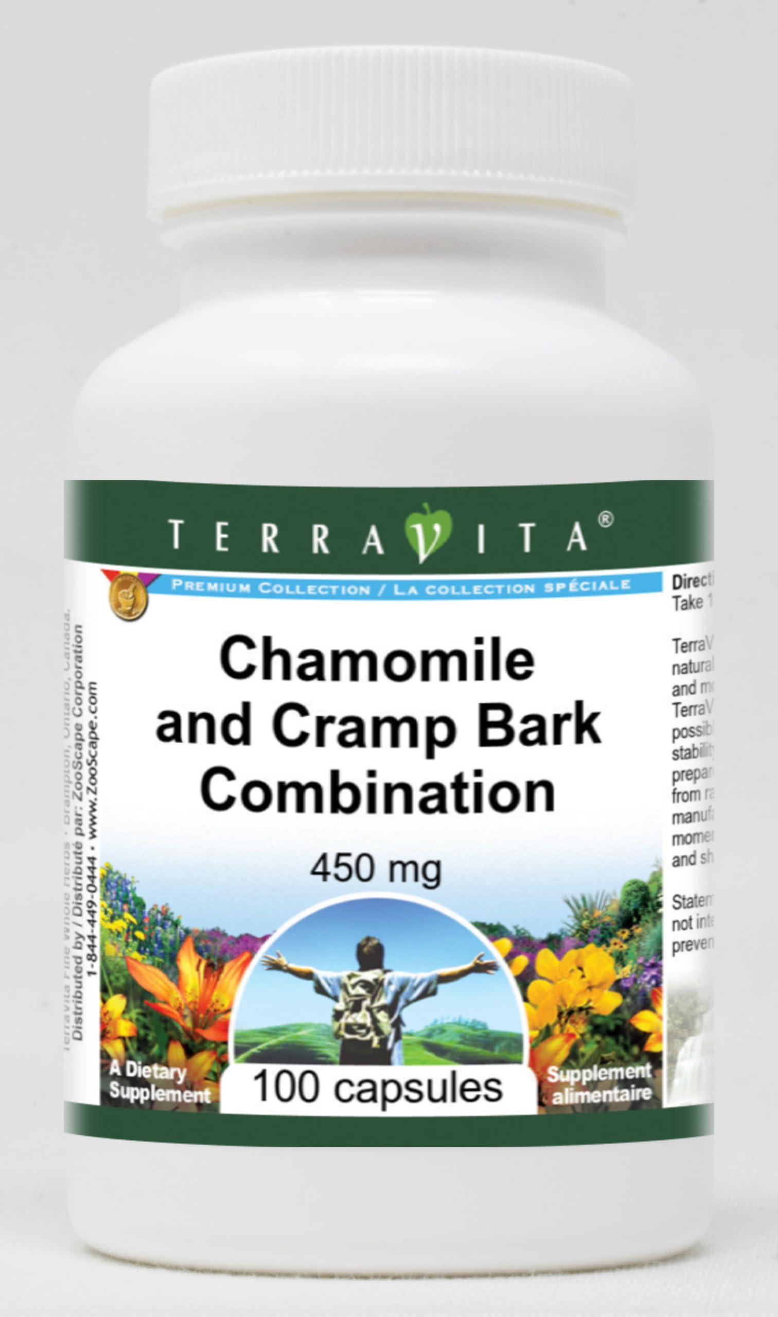 Chamomile and Cramp Bark Combination - 450 mg (100 capsules, ZIN: 513941) Packaged in the United States in a GMP certified facility (Good Manufacturing Practice). No fillers. Manufacturer: TerraVita Size: 100 capsules Easy-to-swallow Capsules in a sealed bottle. Ingredients: Gelatin, Water, Chamomile Flower - 225 mg, Cramp Bark (Viburnum) - 225 mg