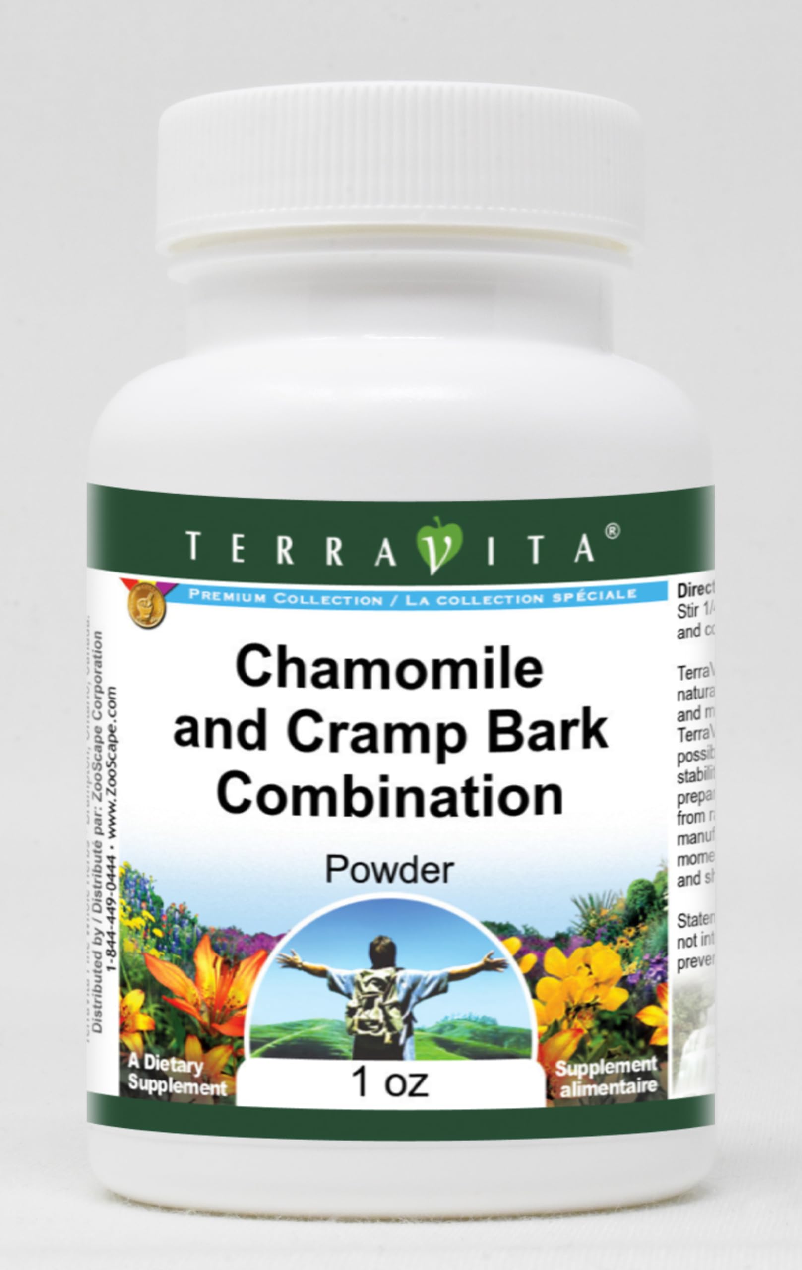 Convenient Powder format. Size: 1 oz. Manufacturer: TerraVita. No fillers. Chamomile and Cramp Bark Combination Powder (1 oz, ZIN: 513943).