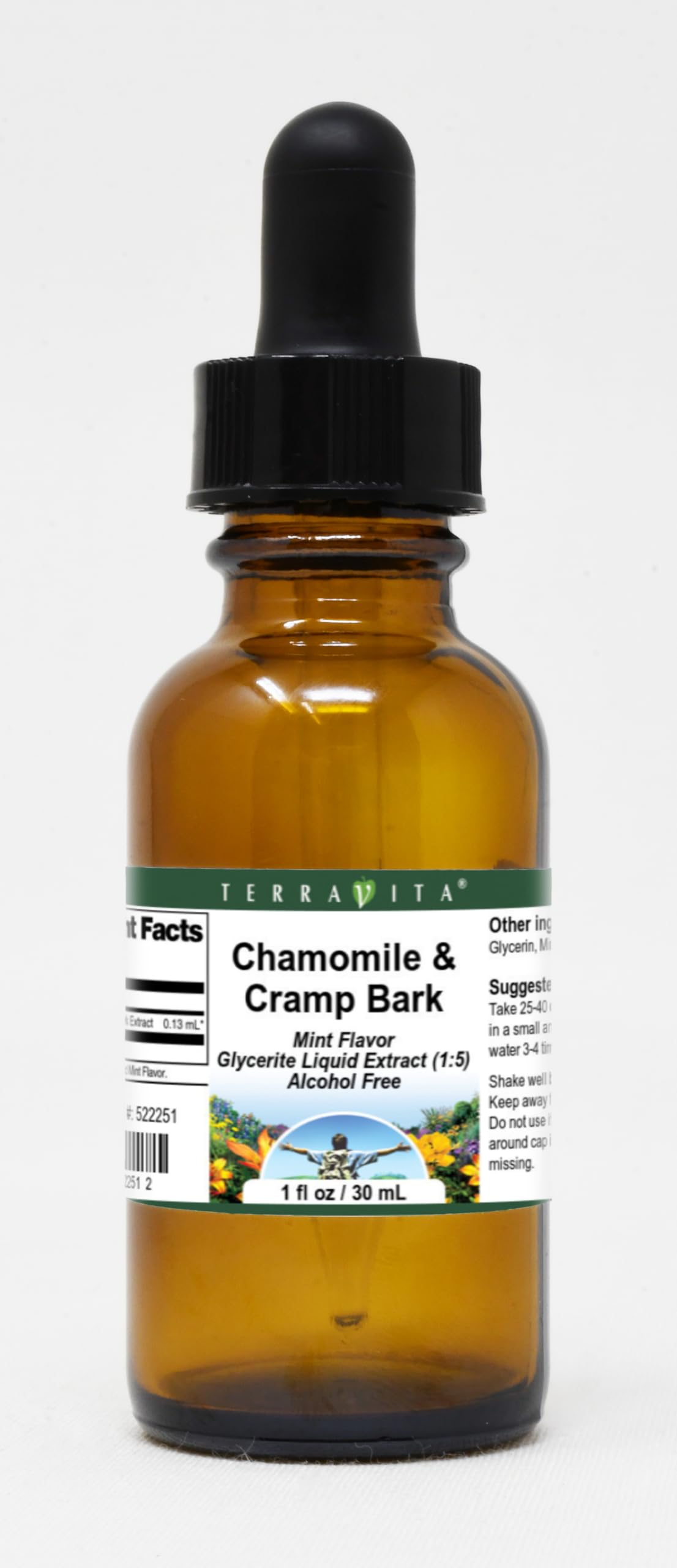 Chamomile Cramp Bark Glycerite Liquid Extract (1:5) - Mint Flavored (1 oz, ZIN: 522251) Packaged in the United States in a GMP certified facility (Good Manufacturing Practice). No fillers. Manufacturer: TerraVita Size: 1 oz Convenient Liquid format. Ingredients: Artificial Mint Flavor, Glycerin (Vegetable Source), Chamomile Flower, Cramp Bark (Viburnum)