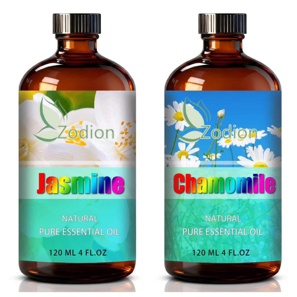 Quality Customer Care- ZODION Essential Oil delivers pure, long-lasting aroma with premium quality. Our responsive customer support ensures a reliable and satisfying experience. Home Fragrance, Bath Self-Care - Chamomile and Jasmine Essential Oil brings a cozy, inviting scent to baths, bedrooms, or living rooms. When diluted, it can be added to baths, lotions, or massages, enhancing daily rituals and promoting calm and rejuvenation. DIY Creative Fragrance Projects - Use Chamomile and Jasmine Essential Oil for DIY candles, soaps, bath bombs, perfumes, or custom essential oil blends. Ideal for hobbyists, wellness enthusiasts, and creative home fragrance projects. Diffuser Use Aromatherapy - Perfect for diffusers, humidifiers, or room sprays, this Chamomile and Jasmine essential oil purifies the air, enhances focus, and promotes calm and relaxation during yoga, meditation, spa, or wellness sessions. 100 Pure Chamomile Jasmine Essential Oil - This 4 Fl Oz 120 ml essential oil is made for everyday aromatic use at home or in the office. Used as a versatile fragrance oil, it energizes the senses, uplifts mood, and creates a cheerful, inviting atmosphere in any space.