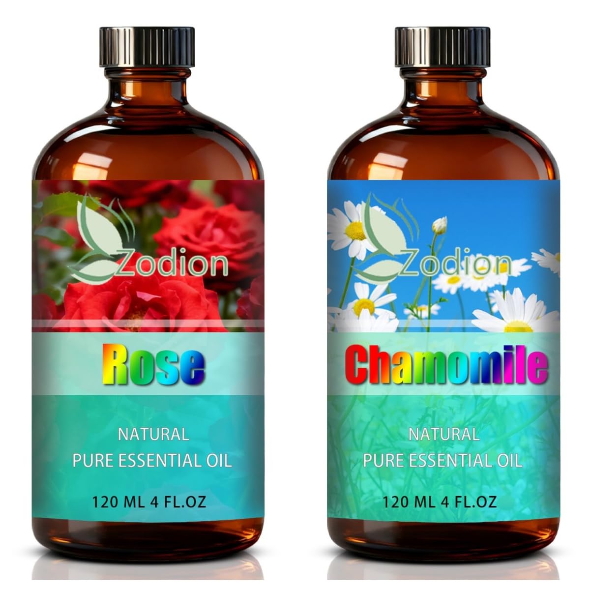 ZODION Rose Essential Oil – Classic rose aroma that elevates the senses, refreshes your space, and enhances baths, diffusers, and DIY creations. ZODION Chamomile Essential Oil – Gentle chamomile scent that soothes the senses, refreshes your space, and enhances baths, diffusers, and DIY blends.