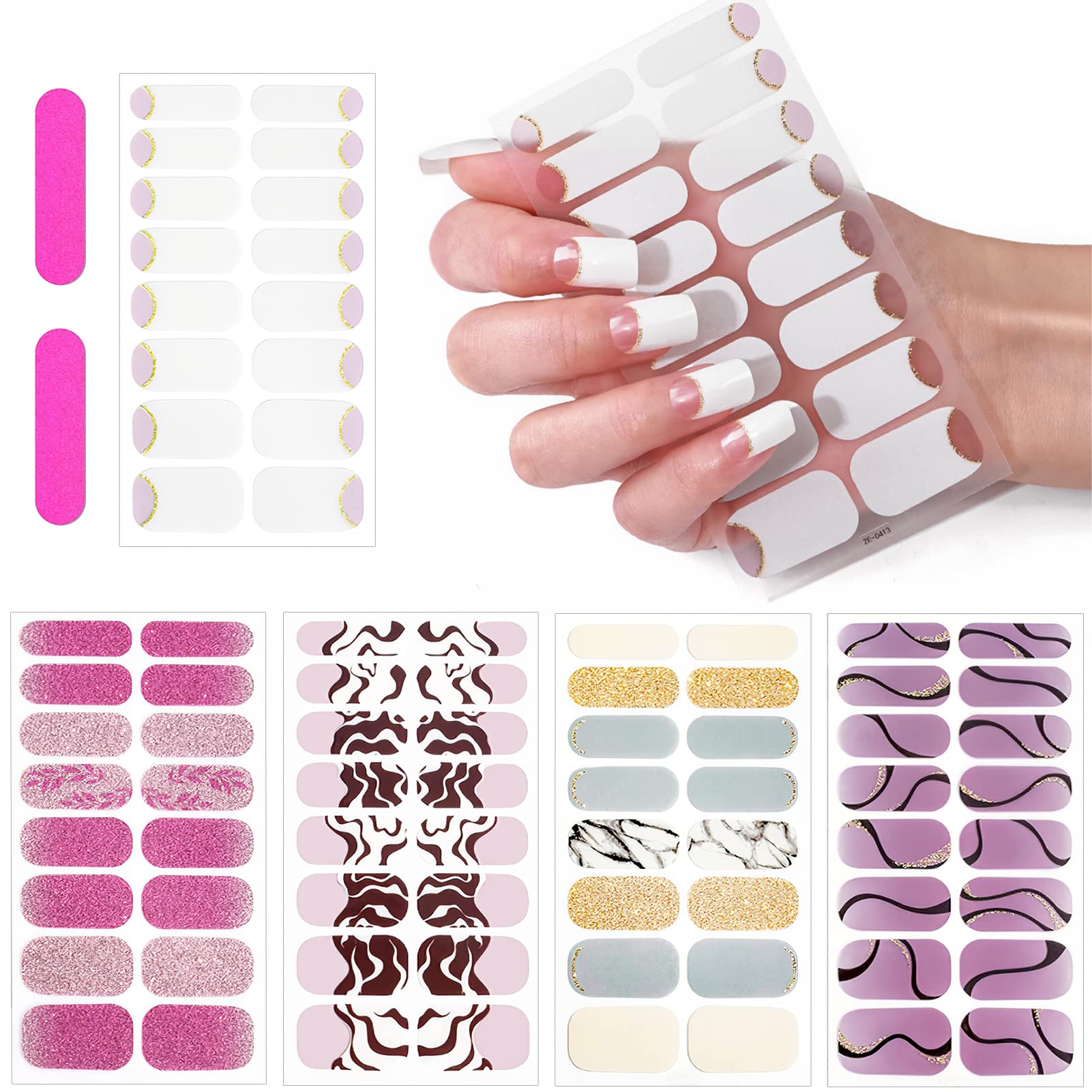 ?Easy to Remove?Please gently reel the wrap stickers off from edge, and then removing work finish !. ?High Quality Material?Nail wraps are made of ABS plastic material, reliable in quality and durable to use, safe and skin-friendly, not easy to be scratched and gentle to your nail and skin, let you create beautiful nail looking with confidence. ?Easy to Use?Nail polish strips are so much quicker and easier than using traditional nail polish. These nail stickers are self-adhesive, stick it gently on your nail and cut it to fit your nail well, then use the nail file to file the edges gently to make it smooth. ?Popular Design?These full nail wraps including various different Latest fashion style , such as French nail,gel glitter nail, marble pattern. These gel nail strips are fashionable to mix up with different style everyday, so they will make your nails more dazzling and charming. ?Package Included?5 Sheets nail polish stickers, each sheet nail polish strips includes 16 tips with 8 different size to meet Various sizes of nails.