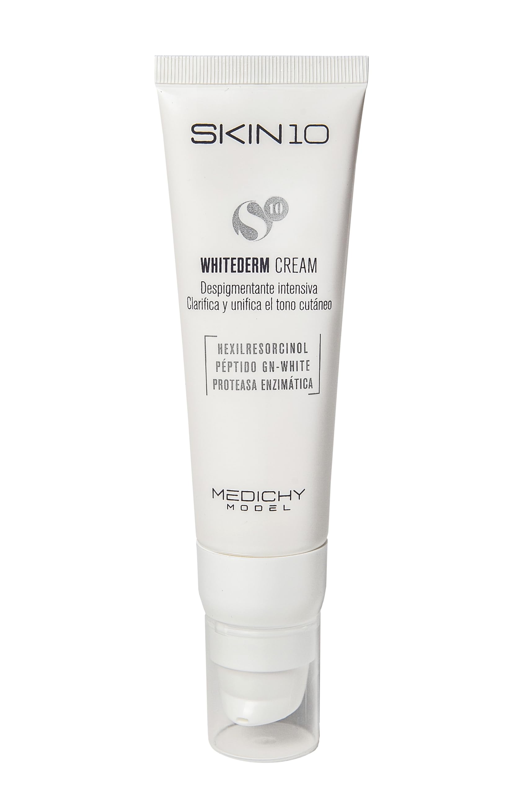 Skin10 Whitederm Cream is a triple action depigmenting cream specially developed to reduce dark spots and even out skin tone. The powerful formula provides a natural glow to the skin, making it look more radiant and even. This cream contains active ingredients that fight imperfections and signs of aging and is therefore perfect for daily use. Enjoy brighter, rejuvenated skin with visible results in a short time.Recommended daily use: Ideal for daily use, provides visible results after a short time. The treatment is enhanced by an enzymatic peeling, which removes the most superficial skin cells and promotes their renewal. Whitening action: Helps lighten the skin in a gentle and safe way, creating a more radiant complexion. Evens out skin tone: Provides a more even and radiant skin tone, improving the overall appearance. Reduces spots: innovative depigmenting formula with triple action on skin spots. Visibly corrects and reduces pigmentation and evens skin tone.MEDICHY MODEL - Skin10 - Whitederm Cream - Verhelderende en depigmenterende crème - Hydraterende formule voor een egale huidtint - 50 ml Skin10 Whitederm Cream is een depigmenterende crème met drievoudige werking, speciaal ontwikkeld om donkere vlekken te verminderen en de huidtint te egaliseren. De krachtige formule zorgt voor een natuurlijke glans op de huid, waardoor deze er stralender en egaler uitziet. Deze crème bevat actieve ingrediënten die onvolkomenheden en tekenen van veroudering bestrijden en is daarom perfect voor dagelijks gebruik. Geniet van een stralendere, verjongde huid met zichtbare resultaten in korte tijd.Aanbevolen dagelijks gebruik: Ideaal voor dagelijks gebruik, geeft al na korte tijd zichtbare resultaten. De behandeling wordt versterkt door een enzymatische peeling, die de meest oppervlakkige huidcellen verwijdert en de vernieuwing ervan bevordert. Blekende werking: Helpt de huid op een zachte en veilige manier lichter te maken, waardoor een stralendere teint ontstaat. Egaliseert de huidtint: zorgt voor een egalere en stralendere huidtint, waardoor het algehele uiterlijk verbetert. Vermindert vlekken: innovatieve depigmenterende formule met drievoudige werking op huidvlekken. Corrigeert en vermindert zichtbaar pigmentatie en egaliseert de huidtint.