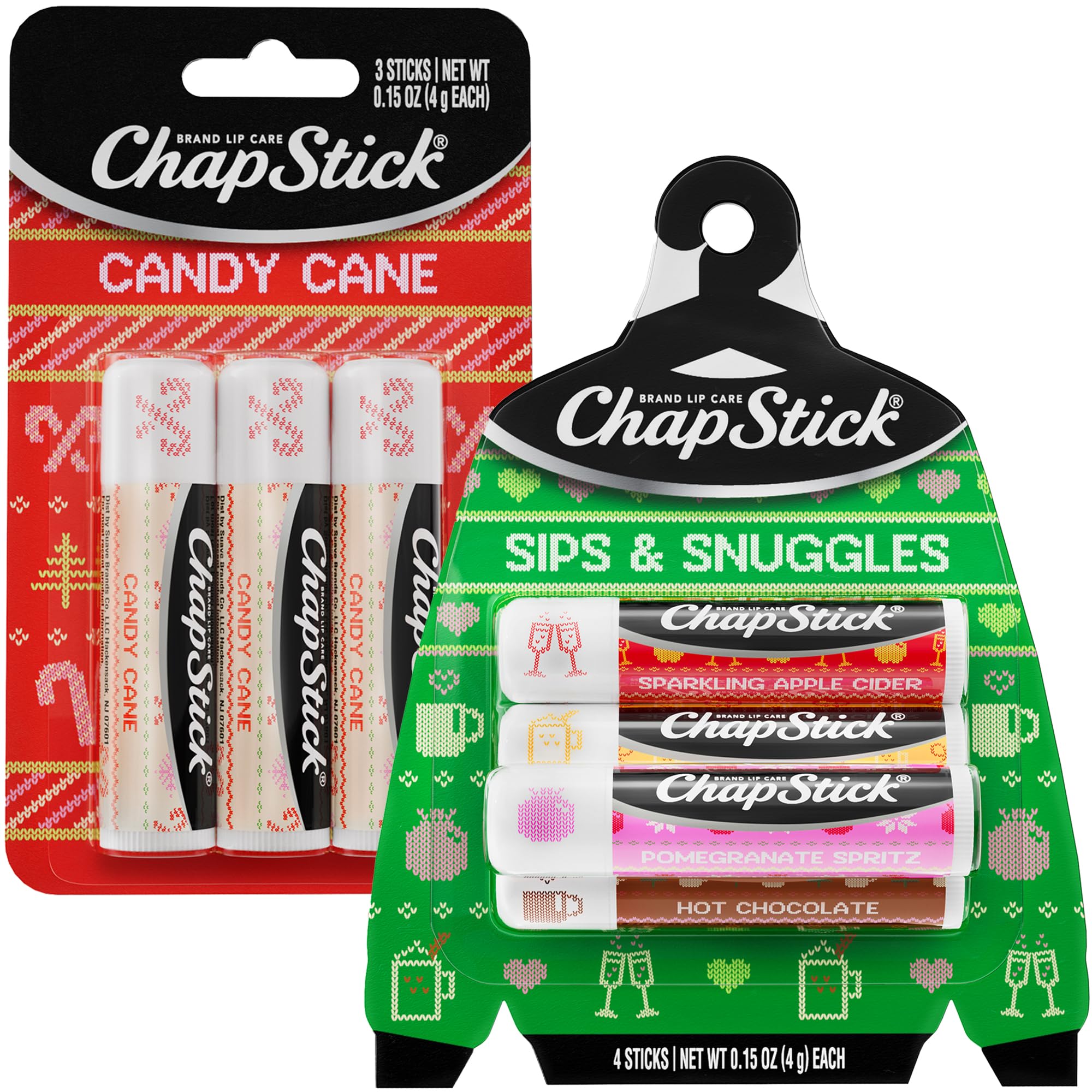 TRUST CHAPSTICK: From America's lip care experts, trusted for over 130 years, our classic formulations won't disappoint. HOW TO USE: Apply ChapStick daily to help keep your lips silky smooth. It's perfect on its own or as a base under lip color. HEALS CHAPPED LIPS: Our time-tested, paraben-free, and cruelty-free lip balms glide on dry, cracked lips without feeling sticky or greasy. AMERICA'S FAVORITE LIP MOISTURIZER: You can't go wrong with an all-American classic you know and love. Enjoy soft, moisturized lips wherever life takes you with ChapStick. CHAPSTICK FAN FAVORITE: Celebrate the holiday season with a cozy collection of ChapStick packs, including Candy Cane and Sips Snuggles (Holiday Nog, Pomegranate Spritz, Sparkling Apple Cider, Hot Chocolate) in a holiday sweater-themed package.