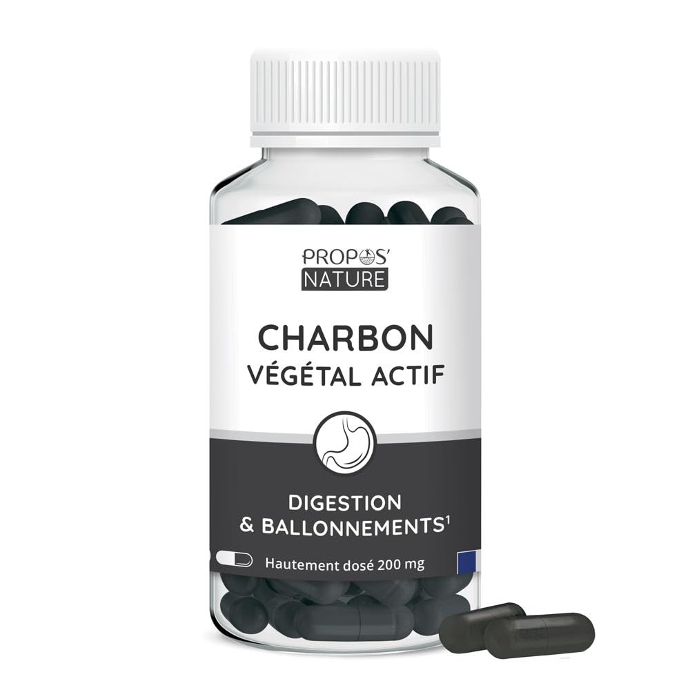 : Known to promote digestive comfort and prevent bloating, Propos'nature Activated Charcoal has been chosen for its strong ability to adsorb gases and toxins produced during digestion. 100 plant-based, it is obtained by calcining coconut shells followed by thermal activation with steam, without the use of chemicals. Activated charcoal can be obtained from various organic materials containing carbon, but coconut shells are the most effective because they provide the highest quality charcoal with a strong adsorption capacity for maximum effectiveness! A 100 natural product. Each capsule contains 200 mg of activated charcoal. Vegetable-based capsule. Disclaimer: FOOD SUPPLEMENT. This is not a medicine. It is not a substitute for a varied and balanced diet and a healthy lifestyle. Do not exceed the recommended dose. Keep out of reach of children. Do not give to people allergic to any of the ingredients. Not recommended for children under 12 years old.HIGH DOSE: Each capsule contains 200 mg of activated charcoal. STRONG ABSORPTION POWER: Activated charcoal can be obtained from various organic materials containing carbon, but coconut shells are the most effective because they provide the highest quality charcoal with a strong adsorption capacity for maximum effectiveness! 100 PLANT-BASED: It is obtained by calcining coconut shells followed by thermal activation with steam, without the use of chemicals. PROMOTES DIGESTION: Known to promote digestive comfort and prevent bloating, Propos'nature activated vegetable charcoal was chosen for its strong ability to adsorb gases and toxins produced during digestion.Description du produit Connu pour favoriser le confort digestif et éviter les ballonnements, le Charbon végétal activé Propos'nature a été choisi pour sa forte capacité à adsorber les gaz et toxines produits lors de la digestion. 100 végétal, il est obtenu par calcination des Coques de noix de coco puis activation thermique à la vapeur d'eau, sans utilisation de produits chimiques. Le Charbon actif peut être obtenu par diverses matières organiques contenant du carbone mais les Coques de noix de coco sont les plus efficaces car elles donnent la plus haute qualité du Charbon avec un fort pouvoir d'adsorption pour une grande efficacité ! Un produit 100 naturel. Chaque gélule est dosée à 200 mg en Charbon actif. Gélule d'origine végétale Clause de non-garantie COMPLÉMENT ALIMENTAIRE. Ceci n'est pas un médicament. Ne se substitue pas à une alimentation variée et équilibrée et à un mode de vie sain. Ne pas dépasser la dose conseillée. Tenir hors de portée des enfants. Ne pas donner aux personnes allergiques à un des composants. Déconseillé chez les enfants de moins de 12 ans.HAUTEMENT DOSÉ : Chaque gélule est dosée à 200 mg en Charbon actif. FORT POUVOIR D'ABSORPTION : Le Charbon actif peut être obtenu par diverses matières organiques contenant du carbone mais les Coques de noix de coco sont les plus efficaces car elles donnent la plus haute qualité du Charbon avec un fort pouvoir d'adsorption pour une grande efficacité !. 100 VÉGÉTAL : il est obtenu par calcination des Coques de noix de coco puis activation thermique à la vapeur d'eau, sans utilisation de produits chimiques. FAVORISE LA DIGESTION : Connu pour favoriser le confort digestif et éviter les ballonnements, le Charbon végétal activé Propos'nature a été choisi pour sa forte capacité à adsorber les gaz et toxines produits lors de la digestion.Charbon végétal actif - 100 naturel - Digestion - Détox - Ballonnements - 200mg - 120 gélules - PROPOS'NATURE