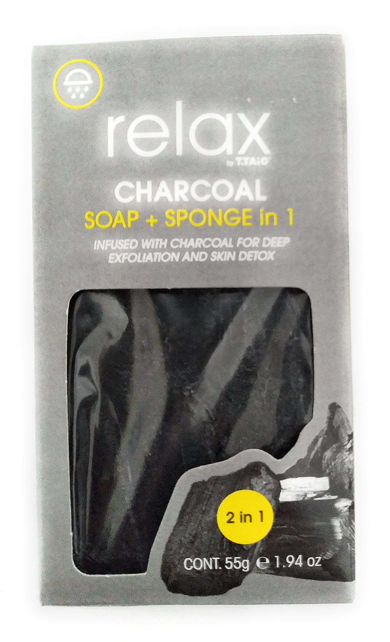 Relax charcoal soap+sponge in 1 Infused with charcoal for deep exfoliation and skin detox.