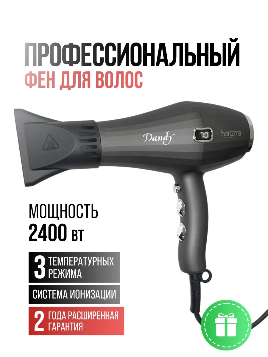 Профессиональный фен для сушки волос Harizma. Стильный и практичный, фен отлично сбалансирован с точки зрения эргономики, имеет оптимальный вес и мощный, надежный мотор AC. Три температурных режима и два режима скорости воздушного потока позволяют настроить идеальную комбинацию для сушки и укладки волос любого типа. Встроенный LED дисплей обеспечивает постоянный визуальный контроль температуры воздушного потока. Благодаря идеальному балансу корпуса фен удобно лежит в руке, а расположение кнопок управления позволяет одинаково работать как правой, так и левой рукой. Для быстрой фиксации локона и закрепления формы прически предусмотрена кнопка подачи холодного воздуха.
