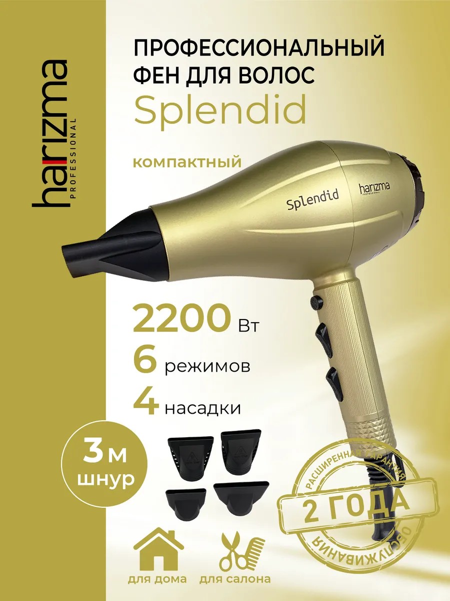 A removable metal filter protects the motor from dust and hair and is easy to clean. This professional hair dryer has a 3m cord with a hanging loop. Our store sells only original, certified products. The super-popular SPLENDID hair dryer from Harizma is a universal gift for your mom, friend, sister, or girlfriend for a birthday, New Year, February 14th, or March 8th!