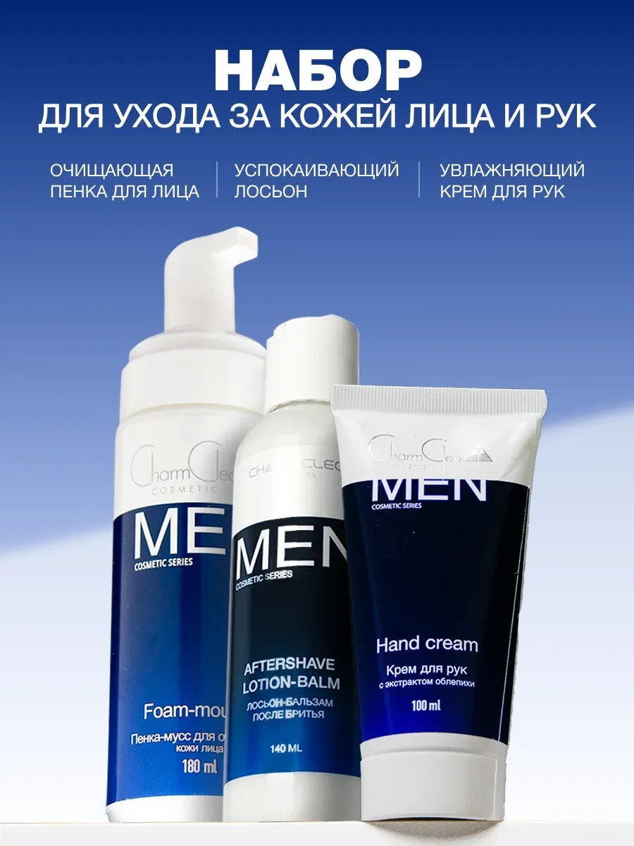 | Комплектация | Лосьон-бальзам после бритья 140 мл; Пенка-мусс очищающий 150 мл; Крем для рук 100 мл |
