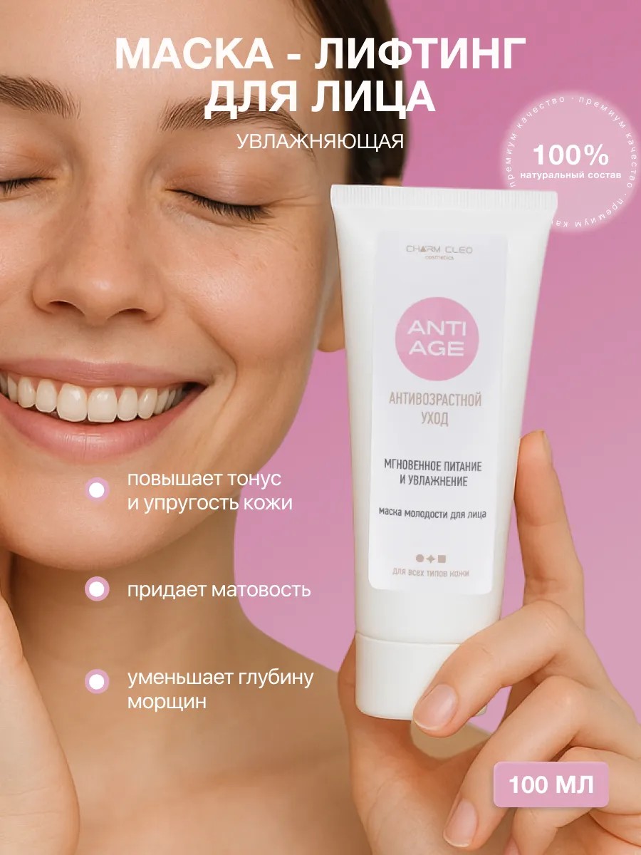 Крем маска для лица и тела увлажняющий лифтинг CharmCleo professional - это профессиональное салонное sos средство для лица и тела, которое вам поможет и теперь вы можете использовать у себя дома в качестве средства по уходу за кожей! Крем маска молодости тотальный лифтинг уход для всех типов кожи благодаря натуральной основе и гармонично подобранным активным компонентам масел семян тыквы, макадамии, какао и семян подсолнечника, розовой и белой глины, а также растительных стволовых клеток и пептидов идеальна для коррекции возрастных изменений, укрепляет и подтягивает ослабленную кожу, улучшает ее структуру, уменьшает глубину морщин и регулирует минеральный обмен, повышает тонус и упругость кожи, интенсивно питает, увлажняет и восстанавливает, придает красивый ровный цвет, делает контуры лица более четкими. Перед применением важно очистить кожу лица шеи и декольте (можно применять после ванны и душа), затем, по необходимости, нанести на лицо тоник или увлажняющий лосьон. Распределите питательный крем по лицу, после нанесения оставьте ее на коже на 10-20 минут, затем смойте водой и нанесите стимулирующий тоник. Маска для лица представленная в объеме 100 мл, может использоваться как мужская и женская. В Charm Cleo Вы можете найти полный комплекс продуктов по уходу за кожей: большой выбор очищающих средств для умывания, тоников, сывороток и кремов, а также других масок. Вам нужна маска из глины (глиняная), альгинатная, тканевая, грязевая, гидрогелевая, кислородная, коллагеновая, кремовая, масляная, маска пленка, распаривающая, кислотная, разогревающая, компрессионная, гелевая или любая другая косметическая маска? В Charm Cleo Вы найдете большинство из них и подберете для себя именно то, что искали! Познакомьтесь с огромным ассортиментом наших косметических масок: ботокс эффект с морскими водорослями и витаминами, тонизирующая и подтягивающая с щавелем, восстанавливающая маска с эффектом ультра лифтинга против мимических морщин с пептидами и маслом тыквы