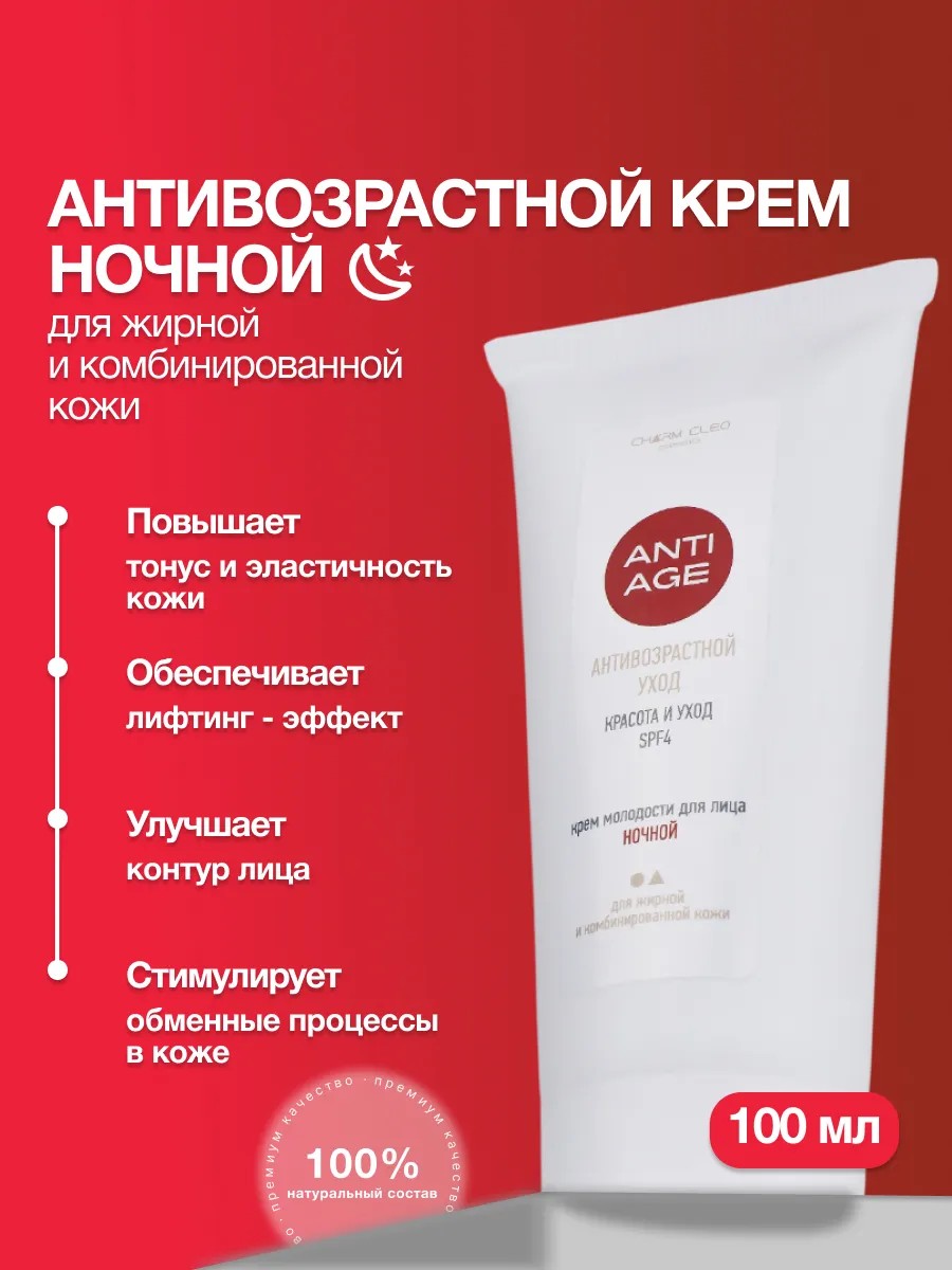 Высокоэффективный антивозрастной ночной крем для жирной и смешанной кожи бережно восстанавливает, интенсивно питает и успокаивает. Обеспечивает лифтинг эффект, стимулирует обменные процессы и наполняет энергией. Уменьшает морщины, улучшает контур лица, повышает упругость и тонус. Активные ингредиенты: экстракты женьшеня, хмеля, рябины, масла макадамии и подсолнечника. Линия ANTI AGE разработана для коррекции возрастных изменений кожи лица и шеи. Способ применения: нанесите крем тонким слоем на очищенную кожу лица и шеи каждый вечер. Попробуйте другие крема Charm Cleo: для лица омолаживающий, матирующий (матовый), интенсивно увлажняющий, противовоспалительный с соком калины для жирной и комбинированной кожи с спф защитой; для шеи и зоны декольте (груди) с персиком и черным чаем, для упругости и увлажнения возрастной кожи (день, вечер); питающий женьшеневый; антибактериальный разглаживающий с прополисом; осветляющий и отбеливающий от веснушек и пигментации; успокаивающий зимний крем (идеальный для холода, зимы, мороза, ветра и непогоды); лечебный монастырский заживляющий сос крем от зуда, содержащий декспантенол (д пантенол), крем для ног от варикоза (расширения вен), для пяток (от трещин и натоптышей), кокосовый крем и облепиховый для рук и ногтей (с облепихой); себорегулирующий крем для проблемной кожи против акне (прыщей, угрей, угревой сыпи, acne), постакне, воспалений, высыпаний, раздражений, для сужения пор и удаления черных точек (для носа и подбородка); крем корректор для тела антицеллюлитный с фруктовыми AHA кислотами, в состав которого входят лаванда, ламинария, лимон, молочная кислота и натуральный чай; разогревающий массажный крем (для массажа с целью похудения, от целлюлита и для обертывания); плотный бальзам с маслом тыквы, продукты для ухода после загара (солнца, солярия); крема из мужской серии MAN с маслом ши.