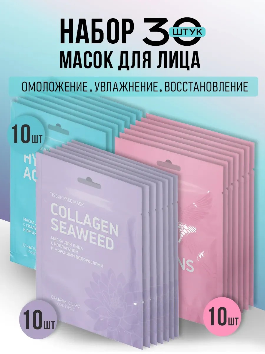 cosmetic sheet mask is just what you need. The CharmCleo sheet mask set is a professional salon-quality SOS product you can use at home! The sheet mask sets consist of three types. The PINK one with silk proteins helps restore tired and aging skin, relieves fatigue, eliminates puffiness, stimulates collagen synthesis, refreshes and nourishes the skin, instantly saturates the skin with moisture, eliminates dryness and flaking. Silk proteins improve the skin's condition, restoring its smoothness, firmness, and elasticity. The PURPLE rejuvenating one with collagen and seaweed tones and moisturizes, stimulates cell renewal, oxygenates and refreshes, restores softness and elasticity to the skin, helps prevent acne, normalizes sebaceous gland function, and suppresses inflammation. The BLUE moisturizing mask with hyaluronic acid and organic silicon tones and hydrates the skin, strengthening connective tissue. This skin care set includes Epidermosil, a special complex that promotes cellular renewal and hydrates the skin. Active ingredients: low-molecular-weight hyaluronic acid moisturizes and boosts skin immunity, while organic silicon hydrates the skin and strengthens connective tissue. Directions: Cleanse your face (can be used after a bath or shower), then apply a toner or moisturizing lotion as needed. Remove the mask from the packaging, unfold it, and apply it to your face. Leave it on for 20-30 minutes, then gently remove it and gently massage the remaining serum into the skin until completely absorbed. No rinsing required. A course of 2-3 times a week is recommended. Ideal for both winter and summer. It will prepare your skin for makeup application. Can be used for both men and women.
