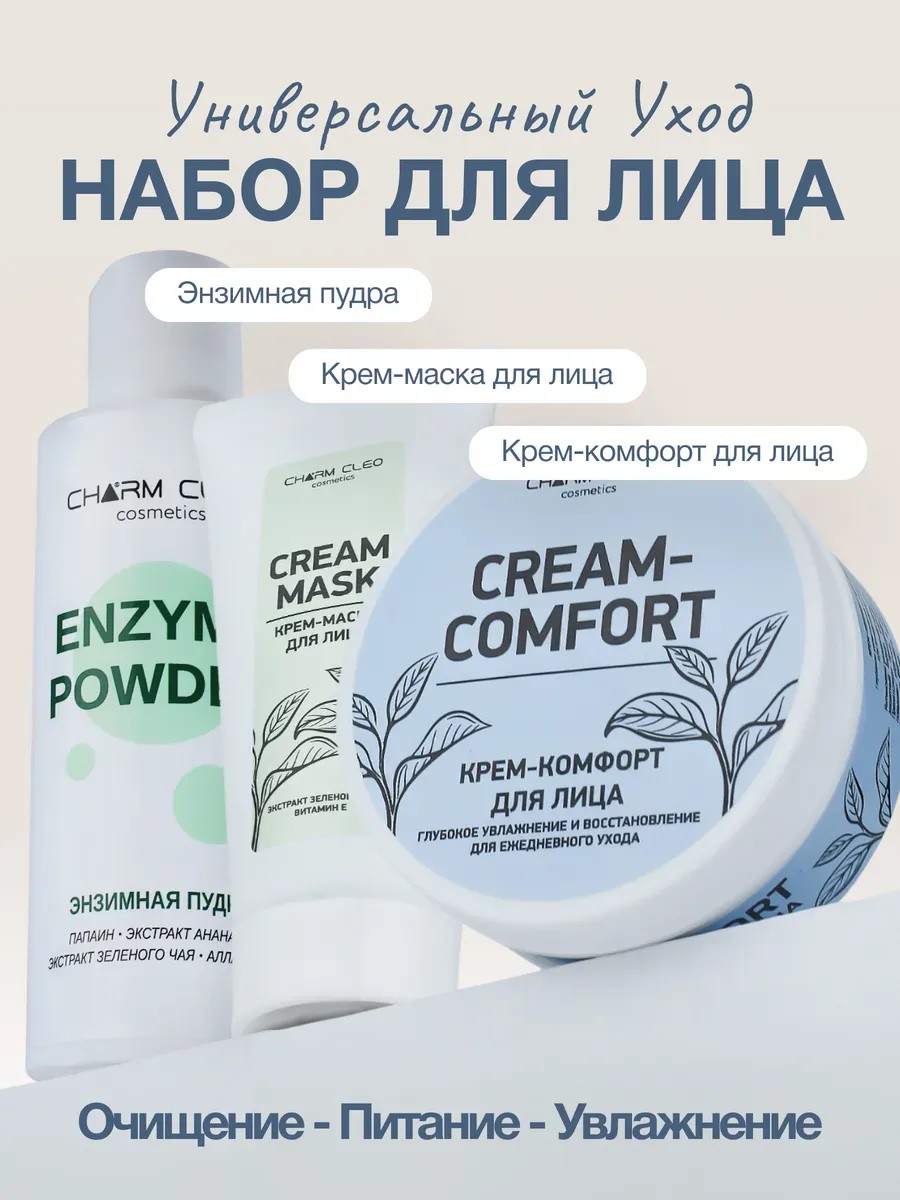Представляем инновационный набор для комплексного преображения кожи — крем-комфорт для ежедневного ухода, крем-маска с экстрактом зеленого чая и энзимная пудра для глубокого очищения. Это три шага к идеальной коже: интенсивное увлажнение, мгновенное восстановление и бережное обновление. Теперь вам не нужно выбирать — только комплексный уход, который работает на 100%!
