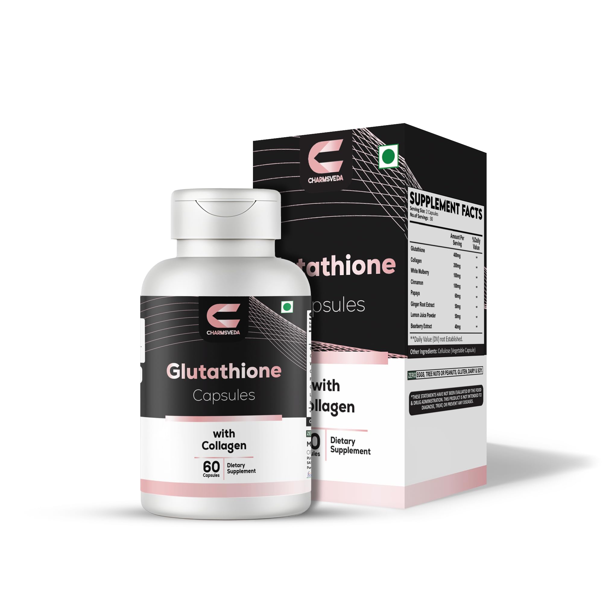 Serving Guide – Take two (2) capsules daily with meals, or as directed by your healthcare professional. Each bottle contains 60 capsules (30 servings). About CHARMSVEDA – Distributed by CHARMSVEDA LLC (Delaware, USA), offering premium supplements crafted from carefully sourced global ingredients. Clean, Vegan Friendly Ingredients – Free from gluten, dairy, soy, eggs, peanuts, and tree nuts. Made with vegetable cellulose capsules. Multi-Ingredient Wellness Blend – Designed to be part of a daily nutrition routine. Skin Care Nutrition – Glutathione, Collagen, White Mulberry, and Bearberry Extract for skin nourishment.