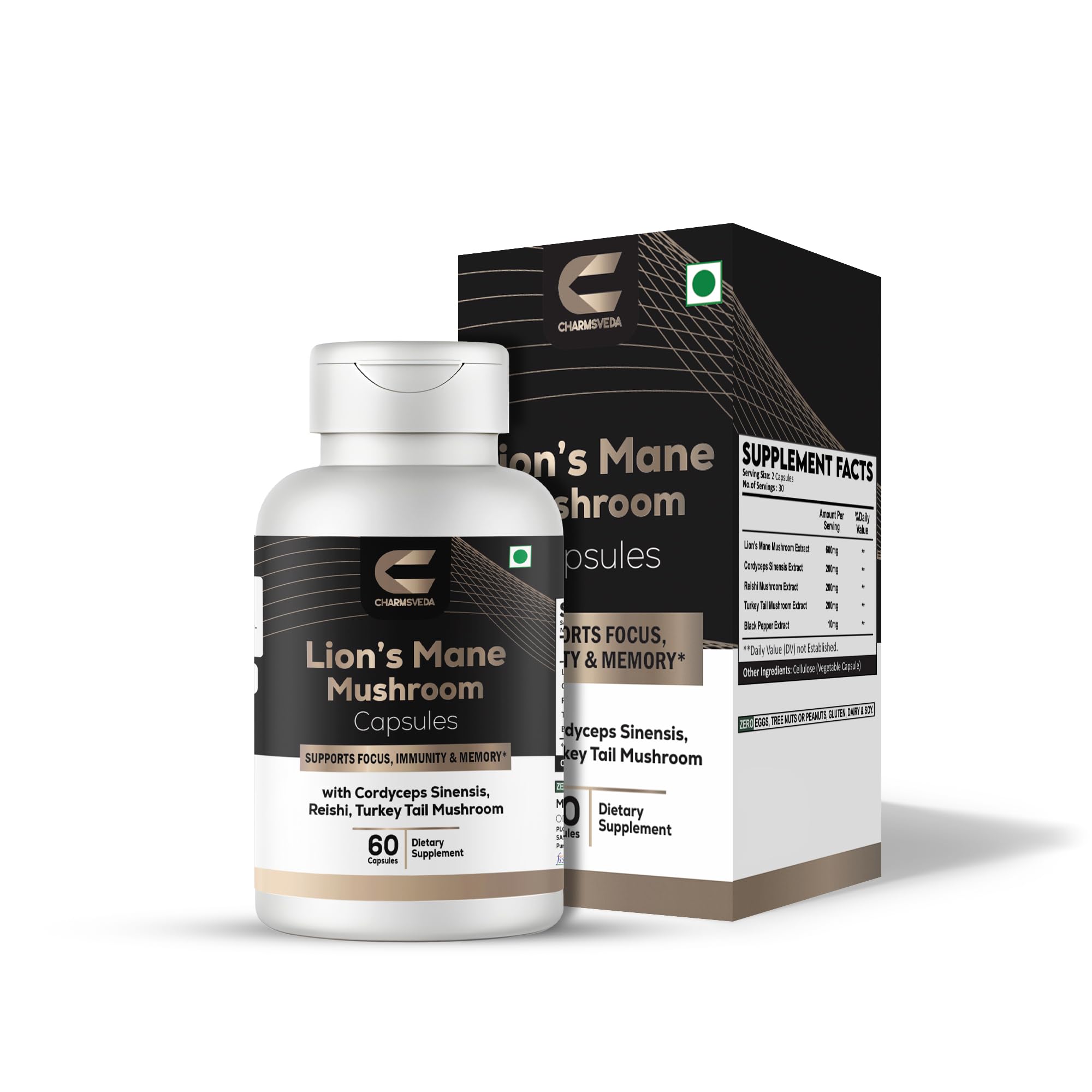CHARMSVEDA Lion s Mane Mushroom Capsules with Cordyceps Reishi & Turkey Tail Herbal & Immune Support Overall Wellness & Immune Support* 60 Vegan Capsules