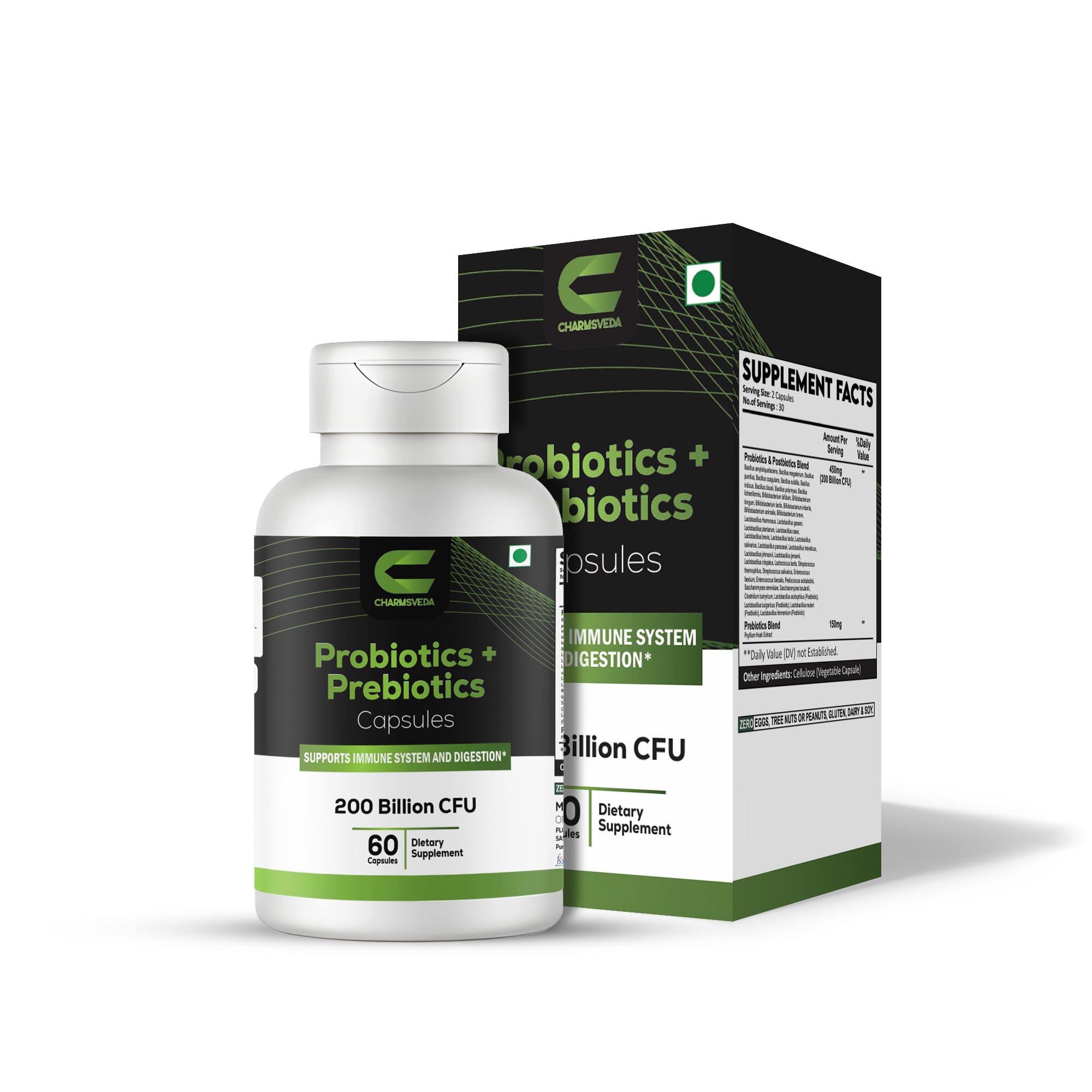 CHARMSVEDA Probiotics + Prebiotics Capsules Support Digestive & Gut Health Overall Wellness & Immune Support* 200 Billion CFU 60 Vegan Capsules