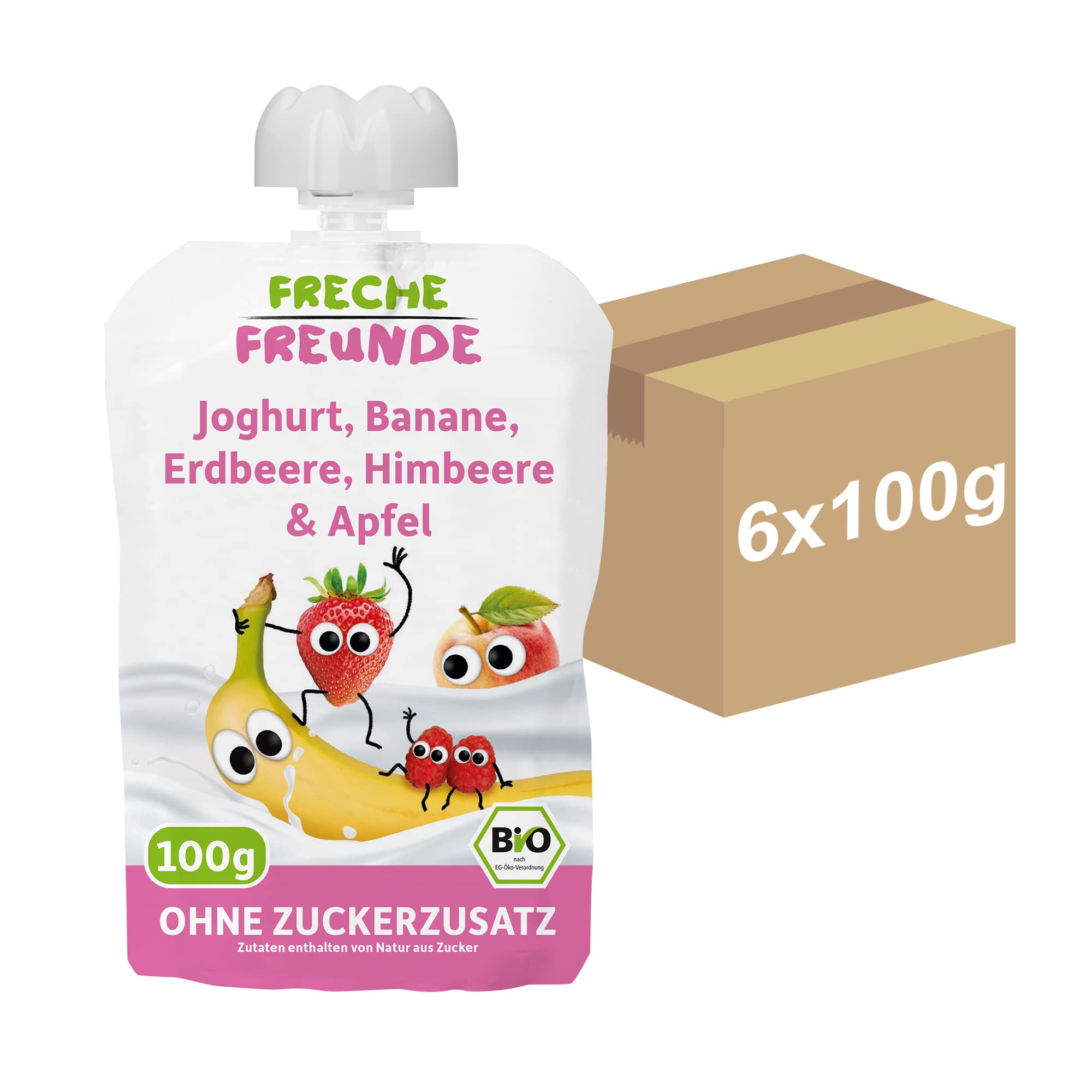 Fruity organic fruit puree meets mild yogurt.With Edda Erdberere and Hansi raspberry - what a mix!Additions?Don't get the cheeky friends in the squeeze!Ideal for on the go, 100% organic, not subject to cooling! Ingredients / ingredients Ingredients: yogurt* (heat -treated) (39%), banana puree*, strawberry puree* (23%), raspberry puree* (3%), apple puree*, rice flour*.* = from organic farming Instructions ready for consumption Address manufacturer/importer Schönhauser Allee 148 10435 Berlin More paper composite packaging.The ideal companion on travel, on the go or for the daycare center.Fun and delicious: squeezing fun - a portion of fruit yoghurt puree in a squeeze bag to squeeze out.Practical to take away: no more spill - 100 percent fruit pushing with yogurt spastifiers packed in a practical squeezing bag - the ideal children's snack from 1 year.100 percent organic: The squeeze for children is in a certified organic quality, only with fruitful sugar and no further additives. Fruchtiges Bio-Obstpüree trifft auf milden Joghurt. Mit Edda Erdbeere und Hansi Himbeere - was für eine Mischung! Zusätze? Kommen den Frechen Freunden nicht in den Quetschbeutel! Ideal für unterwegs, 100% Bio, nicht kühlpflichtig! INHALTSSTOFFE / ZUTATEN Zutaten: JOGHURT* (wärmebehandelt) (39%), Bananenpüree*, Erdbeerpürree* (23%), Himbeerpüree* (3%), Apfelpüree*, Reismehl*. * = aus biologischem Landbau GEBRAUCHSANWEISUNG verzehrfertig ANSCHRIFT HERSTELLER/IMPORTEUR Schönhauser Allee 148 10435 Berlin MehrPapierverbund-Verpackung. Der idealer Begleiter auf Reisen, unterwegs oder für die Kita. Spaßig und Lecker: Quetschspaß - eine Portion Frucht-Joghurt Püree im Quetschbeutel zum Herausquetschen. Praktisch zum Mitnehmen: Kein Kleckern mehr - 100 Prozent Fruchtmus mit Joghurt kleckersicher im praktischen Quetschbeutel verpackt - der ideale Kindersnack ab 1 Jahr. 100 Prozent BIO: Der Quetschie für Kinder ist in geprüfter Bio-Qualität, nur mit fruchteigenen Zucker und keine weiteren Zusätze.FRECHE FREUNDE Bio Quetschie, Banane, Erdbeere, Himbeere & Apfel, Fruchtmus mit Joghurt im Quetschbeutel für Babys ab 1 Jahr, 6 x 100g Banane, Erdbeere, Himbeere & Apfel 6 Stk.