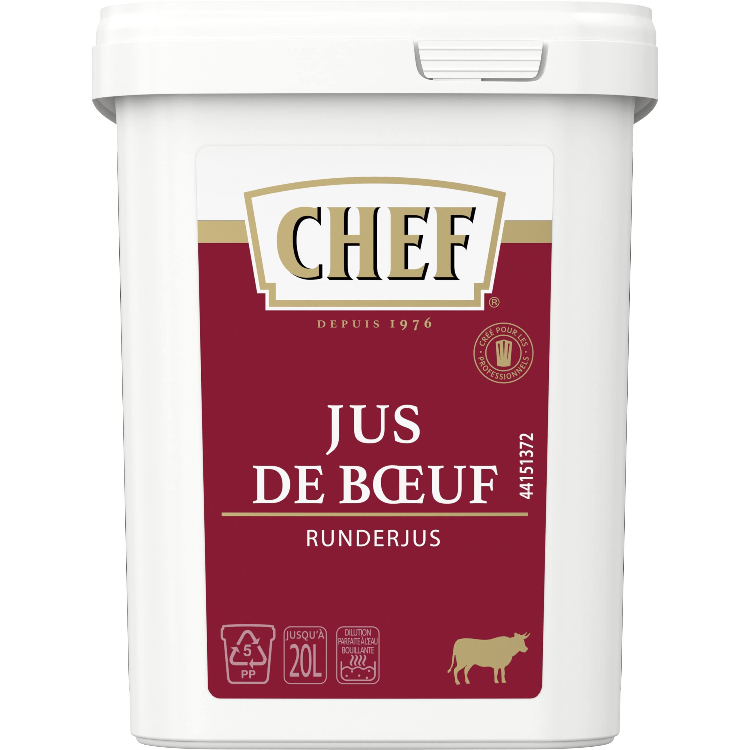 CHEF Dehydrated Beef Juice is a dehydrated juice with a powerful and rich recipe in taste. The alliance between the full-bodied flavor of pinched juices and the fine and delicate taste of beef INGREDIENTS Starches, glucose syrup, iodized salt, yeast extract, flavorings (with CELERY), sunflower oil, onion, coloring (plain caramel), chicory extract, salt, tomato, beef cooking juice 1.2 , garlic, carrot, white pepper, bay leaf, thyme.Practical, airtight, resealable, stackable and recyclable packaging A clear label facilitating the identification of the range, the product and key information A detachable traceability slip Very good value for money: guarantee of compliance with NESTLÉ PROFESSIONAL quality requirements at a controlled cost. How to cook with CHEF Dehydrated Beef Jus: 1) Dissolve the product in boiling or cold liquid 2) Maintain or bring to a boil 3) Cook for 3 minutes. Dehydrated beef jus Perfect dilution in boiling water Excellent resistance to cold liaison Very low fat content as prepared: NutriScore B. CHEF Dehydrated Beef Jus is the ideal base for making more or less full-bodied jus, deglazing cooking or vinaigrette. Seasoned with capers and gherkins, this jus is the perfect accompaniment to shredded oxtail in salad. CHEF Dehydrated Beef Jus is a dehydrated juice with a powerful and flavorful recipe. It combines the full-bodied flavor of pinched juices with the fine, delicate taste of beef. Le Jus De Boeuf Déshydraté CHEF est un Jus déshydraté avec une recette puissante et riche en goût. L'alliance entre la saveur corsée des sucs pincés et le goût fin et délicat de la viande de bœuf INGRÉDIENTS Fécules, sirop de glucose, sel iodé, extrait de levure, arômes (avec CÉLERI), huile de tournesol, oignon, colorant (caramel ordinaire), extrait de chicorée, sel, tomate, jus de cuisson de viande de boeuf 1,2 , ail, carotte, poivre blanc, laurier, thym.Un conditionnement pratique, hermétique, refermable, empilable et recyclable Une étiquette claire facilitant l'identification de la gamme, du produit et des informations clés Un bordereau de traçabilité détachable Un très bon rapport qualité prix : garantie du respect des exigences qualité de NESTLÉ PROFESSIONAL à un coût maîtrisé. Comment cuisiner à l'aide du Jus de Boeuf Déshydraté CHEF: 1) Délayez le produit dans le liquide bouillant ou froid 2) Maintenez ou portez à ébullition 3)Faites cuire pendant 3 minutes. Jus de boeuf déshydraté Dilution parfaite à l'eau bouillante Excellente tenue en liaison froide À très faible teneur en matières grasses tel que préparé: NutriScore B. Le Jus De Boeuf Déshydraté CHEF est la base idéale pour la réalisation de jus plus ou moins corsés, déglaçage de cuisson ou vinaigrette. Condimenté avec des câpres et des cornichons, ce jus accompagnera parfaitement un effiloché de queue de bœuf en salade. Le Jus De Boeuf Déshydraté CHEF est un Jus déshydraté avec une recette puissante et riche en goût. L'alliance entre la saveur corsée des sucs pincés et le goût fin et délicat de la viande de bœuf.