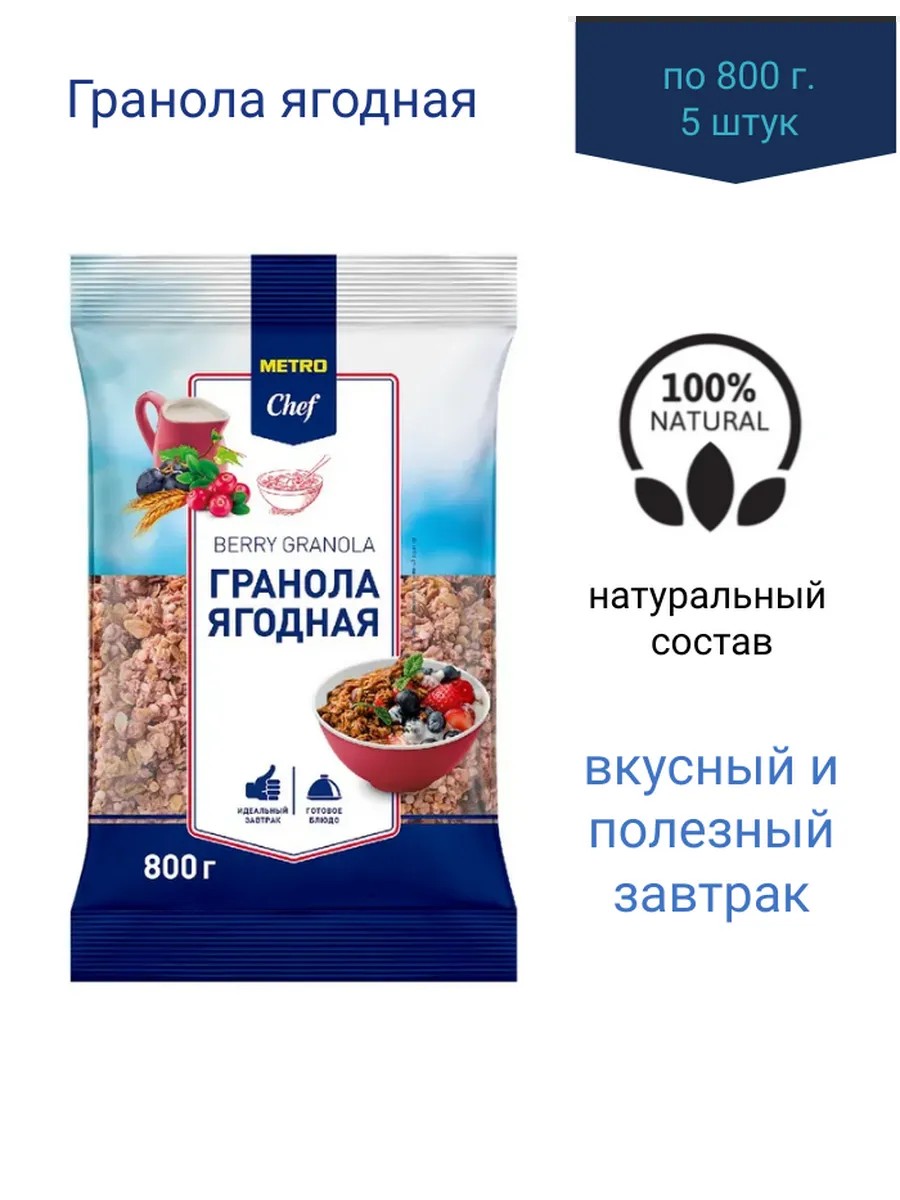 Гранола (мюсли) ягодная от Chef подойдет для похудения, правильного питания и диеты. Отличный вариант завтрака, который будет сочетаться с молоком, кефиром, йогуртом, соком или даже в сухом виде в качестве полезного перекуса. За счёт содержания натуральных ингредиентов: ягод и орехов, хлопья станут отличным источником белка и углеводов, что повысит энергию на весь день.