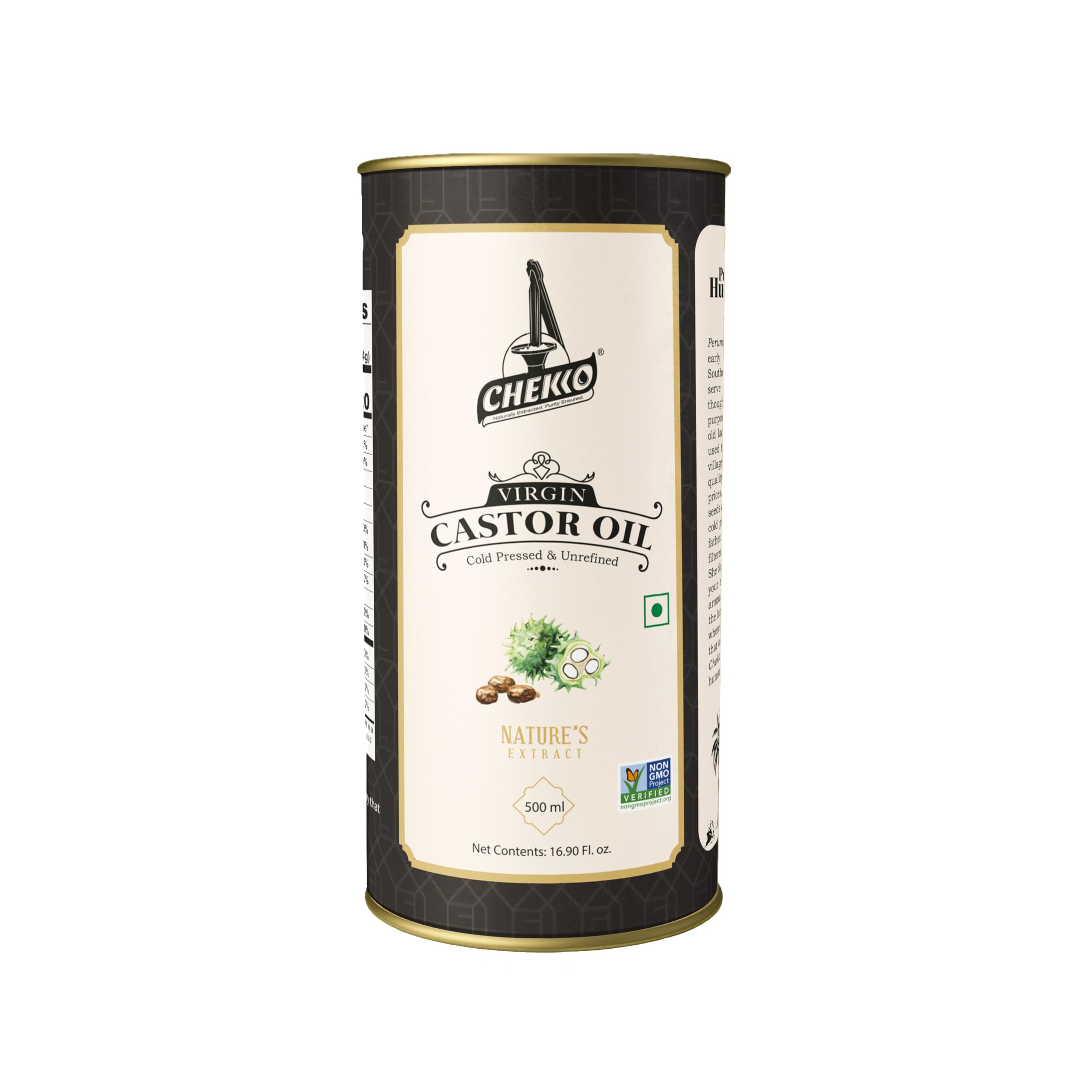 Cleanser - Castor oil can be used as a gentle cleanser to remove dirt, makeup, and impurities without stripping the skin of its natural oils. Natural Skin Moisturizer - Castor oil is a wonderful addition to a skincare routine due to its rich fatty acid content, including ricinoleic acid, which has moisturizing and nourishing properties. When applied to the skin, castor oil deeply penetrates and helps to retain moisture, making it particularly beneficial for dry or dehydrated skin. Its emollient properties also help to soften and smooth the skin's texture, promoting a more supple and youthful appearance. Massage Oil - Castor oil's emollient properties make it an excellent choice for massage, especially for relieving muscle soreness and joint discomfort. When applied to sore areas such as feet, muscles, or joints, castor oil can help soothe inflammation, reduce pain, and promote relaxation. Its moisturizing effect also aids in improving blood circulation to the affected area, which can further alleviate discomfort and support the body's natural healing process. Simply massage a small amount of castor oil onto the sore area and gently rub it in for relief. Castor Oil for Eye Lashes and Eye Brows - When applied to the lashes and eyebrows, caster oils can help strengthen the hair strands, prevent breakage, and encourage fuller and thicker growth over time. Regular application of castor oil to the lashes and eyebrows can contribute to achieving a naturally fuller and more luscious lash line and eyebrow shape. Hair Growth Oil - Castor oil is renowned for its moisturizing properties and its ability to nourish hair follicles, promoting healthier-looking hair growth. Its thick consistency helps in locking in moisture, preventing dryness and breakage. Whether you have curly, straight, or textured hair, high-quality castor oil can be beneficial for all hair types. Regular use of a hair growth oil containing best cold pressed castor oil can contribute to stronger, shinier, and more manageable hair for both women and men. 100 Natural and Pure Castor Oil - Chekko Cold Pressed and Unrefined Hexane Free Castor oil is versatile and can be used in various ways, such as mixing with essential oils for customized blends, incorporating into hair care and skincare routines, and even for aromatherapy massage. The cold pressed extraction process ensures the oil maintains its integrity and purity, making it a safe and effective choice for your beauty and wellness needs. No Artificial Preservatives or chemicals have been used at any point of the 'Extraction, Filtration Packing' process.