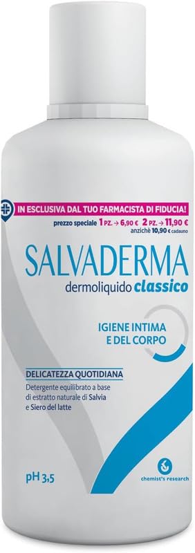 Indications: Gentle cleanser for daily intimate hygiene and full-body cleansing. The synergistic action of natural sage extract and milk serum provides an emollient and toning effect while delivering freshness and well-being. The pH of 3.5 is optimal for maintaining vaginal balance during the fertile years. INGREDIENTS Aqua, Tea-Lauryl Sulfate, Ammonium Lauryl Sulfate, PEG-2 Stearate, Hydrogenated Coconut Oil, Hydroxyethylcellulose, Lactic Acid, Salvia Officinalis Leaf Extract, Lac, Glycol Stearate, Potassium Sorbate, Sodium Benzoate, Ketoglutaric Acid, Cholesterol, Propylene Glycol, ParfumWarnings: Store in a cool place with the cap tightly closed. Cosmetic product, PAO 12 months. Directions for use: Dilute with water and rinse thoroughly. Indications: Gentle cleanser for daily intimate hygiene and full-body cleansing. The synergistic action of natural sage extract and milk serum provides an emollient and toning effect while delivering freshness and well-being. The pH of 3.5 is optimal for maintaining vaginal balance during menstruation.CHEMIST'S RESEARCH SAUVADERMA DERMOLIQUIDE Nettoyant sous-sol équilibré à base d'extrait naturel de sauge et de lactosérum 500 ml testé dermatologiquementDESCRIPTION DU PRODUIT DESCRIPTION DU PRODUIT Indications : nettoyant doux pour l'hygiène intime quotidienne et le nettoyage de tout le corps. Avec l'action synergique de l'extrait naturel de sauge et du sérum du lait assure un effet émollient et tonifiant tout en apportant fraîcheur et bien-être. Le pH 3,5 est optimal pour maintenir l'équilibre vaginal en âge fertile. INGRÉDIENTS Aqua, Tea-Lauryl Sulfate, Ammonium Lauryl Sulfate, PEG-2 Stearate, Hydrogenated Coconut Oil, Hydroxyéthylcellulose, Lactic Acid, Salvia Officinalis Leaf Extract, Lac, Glycol Stearate, Potassium Sorbate, Sodium benzoate, acide ketoglutaric, cholesterol, propylene glycol, ParfumAvertissements : conserver dans un endroit frais avec bouchon fermé. Cosmétique PAO 12 mois. Mode d'emploi : diluer avec de l'eau et rincer soigneusement. Indications : nettoyant doux pour l'hygiène intime quotidienne et le nettoyage de tout le corps. Avec l'action synergique de l'extrait naturel de sauge et du sérum du lait assure un effet émollient et tonifiant tout en apportant fraîcheur et bien-être. Le pH 3,5 est optimal pour maintenir l'équilibre vaginal en âge fertile.
