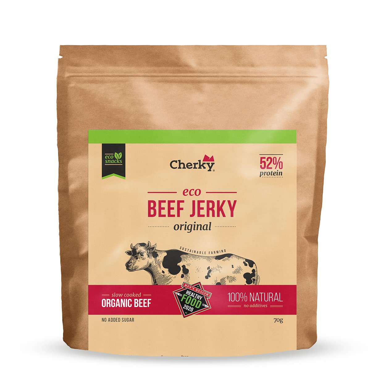 Ingredients ingredients Selected meager beef pieces 94.63 (222g beef for 100g of the finished product), honey , sea salt, onion , garlic , black pepper . Ingredients from ecological farming.Can traces of celery, sesame, soy, nuts and mustard containKeto, outdoor sport - always the perfect snack: Cherky eco beef jery is the ideal organic protein snack for everyone who needs a healthy and carbohydrate interim.Whether with the keto diet, in sports, in nature, on the couch or as a snack between two appointments-our organic beef jerky is perfect for all dried meat lovers.You eat veganThen our ECO Plant Based Jery is just the right thing for you (also available from ).without additives - with 100 organic beef: Like all of our Cherky products, our ECO Beef Jery does not contain any artificial additives, preservatives, dyes or added sugar.Our ingredients and spices come from organic agriculture, as well as the hand -picked beef pieces.The nutritional values of our Eco Jerkys are absolute top - over 52 protein content, hardly carbohydrates and fat and few calories.Simply the perfect organic keto snack for every situation.Ketofriendly: A 30g portion of eco beef jerky organic dry meat contains over 35g protein and only 2.8g of carbohydrates.These top values, the controlled origin from organic agriculture, the juicy tender texture and the strong taste make our organic beef jerky the ideal and healthy low-carb or keto snack.Whenever you need a delicious keto energy boost, you can grab our Cherky Eco Jery and breastfeed your hunger with protein, fat low and ketofriendly.Proteinreich, Keto Bio: Our Cherky Eco Beef Jerky is made exclusively from organic beef by grass -fed cattle from mountain land industry in Spain.The cattle are raised with respect for nature and animals in organic certified agriculture so that the meat has the highest quality.In order to reinforce the natural taste, we add a few organic ingredients and punch the handpicked pieces with low temporature to the best organic dry meat.INHALTSSTOFFE ZUTATEN Ausgewählte magere Rindfleischstücke 94,63 (222g Rindfleisch für 100g des fertigen Produkts), Honig , Meersalz, Zwiebel , Knoblauch , schwarzer Pfeffer . Zutaten aus ökologischem Landbau. Kann Spuren von Sellerie, Sesam, Soja, Nüssen und Senf enthaltenKETO, OUTDOOR SPORT – IMMER DER PERFEKTE SNACK: Cherky ECO Beef Jerky ist der ideale BIO Proteinsnack für Alle, die eine gesunde und kohlenhydratarme Zwischenmahlzeit brauchen. Ob bei der Keto Diät, beim Sport, in der Natur, auf der Couch oder als Snack zwischen zwei Terminen – unser BIO Beef Jerky ist perfekt für alle Trockenfleisch-Liebhaber Innen. Du ernährst Dich veganDann ist unser ECO Plant Based Jerky ebenfalls genau das Richtige für Dich (ebenfalls bei erhältlich). OHNE ZUSATZSTOFFE – MIT 100 BIO RINDFLEISCH: Wie all unsere Cherky Produkte enthält auch unser ECO Beef Jerky keine künstlichen Zusatzstoffe, Konservierungsmittel, Farbstoffe oder zugesetzten Zucker. Unsere Zutaten und Gewürze stammen, ebenso wie die handverlesenen Rindfleischstückchen, aus BIO Landwirtschaft. Die Nährwerte unseres ECO Jerkys sind absolute Spitze – über 52 Proteingehalt, kaum Kohlenhydrate und Fett und wenig Kalorien. Einfach der perfekte BIO Keto Snack für jede Situation. KETOFRIENDLY: Eine 30g Portion ECO Beef Jerky BIO Trockenfleisch enthält über 35g Eiweiß und lediglich 2,8g Kohlenhydrate. Diese Top-Werte, die kontrollierte Herkunft aus BIO Landwirtschaft, die saftig zarte Textur und der kräftige Geschmack machen unser BIO Beef Jerky zum idealen und gesunden Low-Carb oder Keto-Snack. Wann immer Du einen leckeren Keto Energieschub benötigst, kannst Du zu unserem Cherky ECO Jerky greifen und stillst Deinen Hunger proteinreich, fettarm und ketofriendly. PROTEINREICH, KETO BIO: Unser Cherky ECO Beef Jerky wird ausschließlich aus BIO Rindfleisch von grassgefütterten Rindern aus Berglandwirtschaft in Spanien hergestellt. Die Rinder werden in BIO zertifizierter Landwirtschaft mit Respekt vor Natur und Tier aufgezogen, damit das Fleisch die höchste Qualität aufweist. Um den natürlichen Geschmack zu verstärken, fügen wir einige wenige BIO Zutaten hinzu und pöckeln die handverlesenen Stücke bei niedriger Temparatur zu bestem BIO Trockenfleisch.Cherky ECO Beef Jerky BIO Original, 1 x 70g – Edles BIO Beef Jerky Trockenfleisch von grasgefüttertem spanischem BIO Rindfleisch, Keto, ohne Zusatzstoffe, ohne Gentechnik, BIO zertifiziert