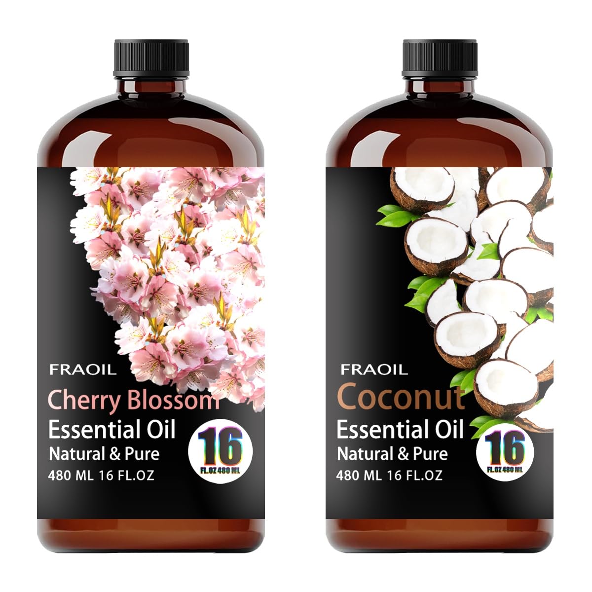 Cherry Blossom Essential Oil 16 Fl Oz and Coconut Essential Oil 16 Fl Oz for Diffuser Humidifier Yoga Cleaning DIY Candle Soap Making Perfume Gift for Essential Oils