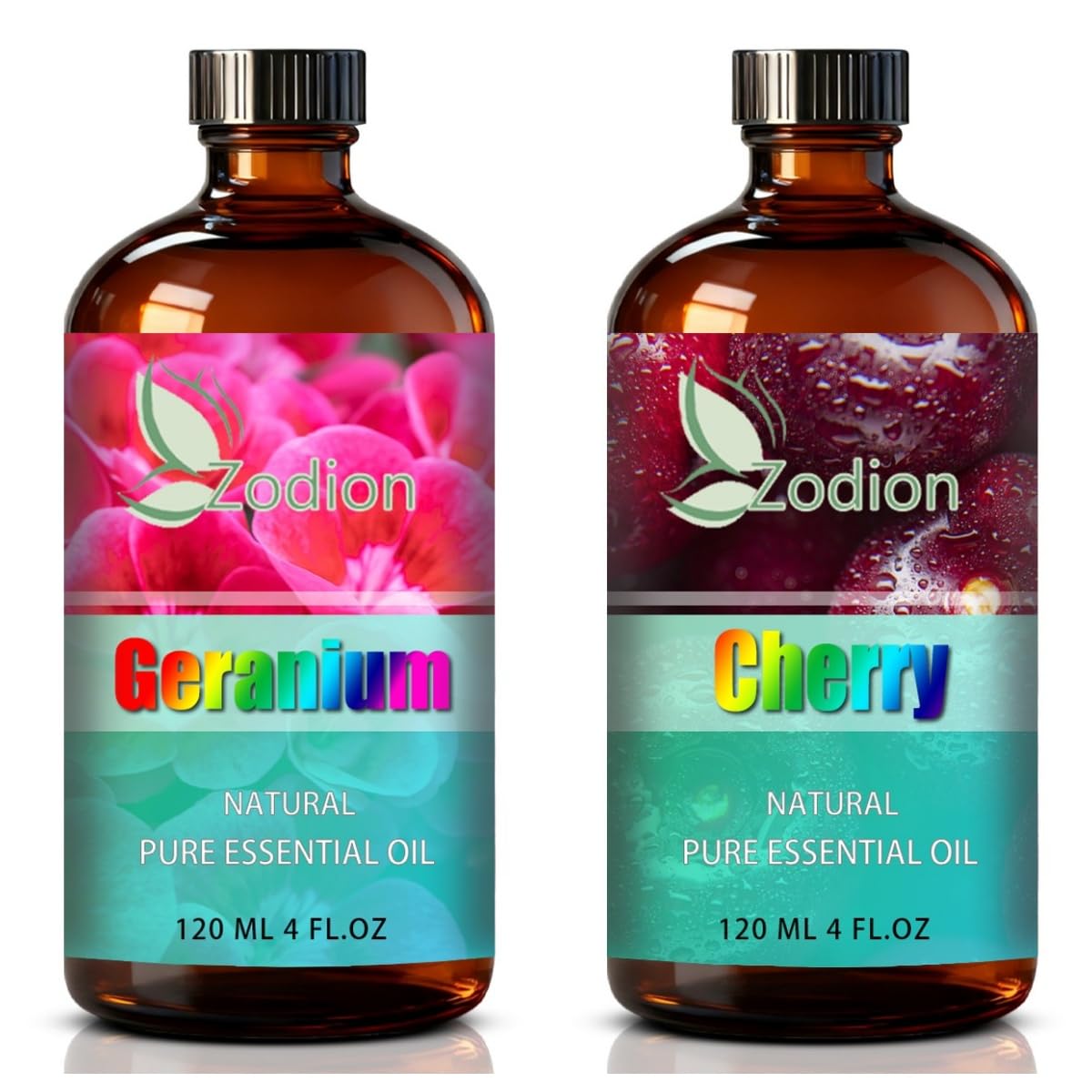 Quality Customer Care- ZODION Essential Oil delivers pure, long-lasting aroma with premium quality. Our responsive customer support ensures a reliable and satisfying experience. Home Fragrance, Bath Self-Care - Cherry and Geranium Essential Oil brings a cozy, inviting scent to baths, bedrooms, or living rooms. When diluted, it can be added to baths, lotions, or massages, enhancing daily rituals and promoting calm and rejuvenation. DIY Creative Fragrance Projects - Use Cherry and Geranium Essential Oil for DIY candles, soaps, bath bombs, perfumes, or custom essential oil blends. Ideal for hobbyists, wellness enthusiasts, and creative home fragrance projects. Diffuser Use Aromatherapy - Perfect for diffusers, humidifiers, or room sprays, this Cherry and Geranium essential oil purifies the air, enhances focus, and promotes calm and relaxation during yoga, meditation, spa, or wellness sessions. 100 Pure Cherry Geranium Essential Oil - This 4 Fl Oz 120 ml essential oil is made for everyday aromatic use at home or in the office. Used as a versatile fragrance oil, it energizes the senses, uplifts mood, and creates a cheerful, inviting atmosphere in any space.