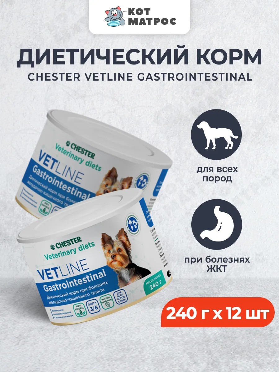 | Полное наименование товара | Chester Vetline Gastrointestinal влажный диетический корм для взрослых собак всех пород при заболеваниях ЖКТ - 240 г х 12 шт |