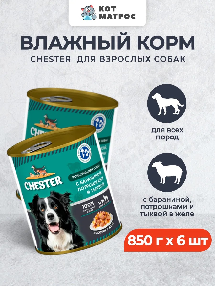 | Полное наименование товара | Chester влажный корм для взрослых собак всех пород с бараниной, потрошками и тыквой, кусочки в желе - 850 г х 6 шт |