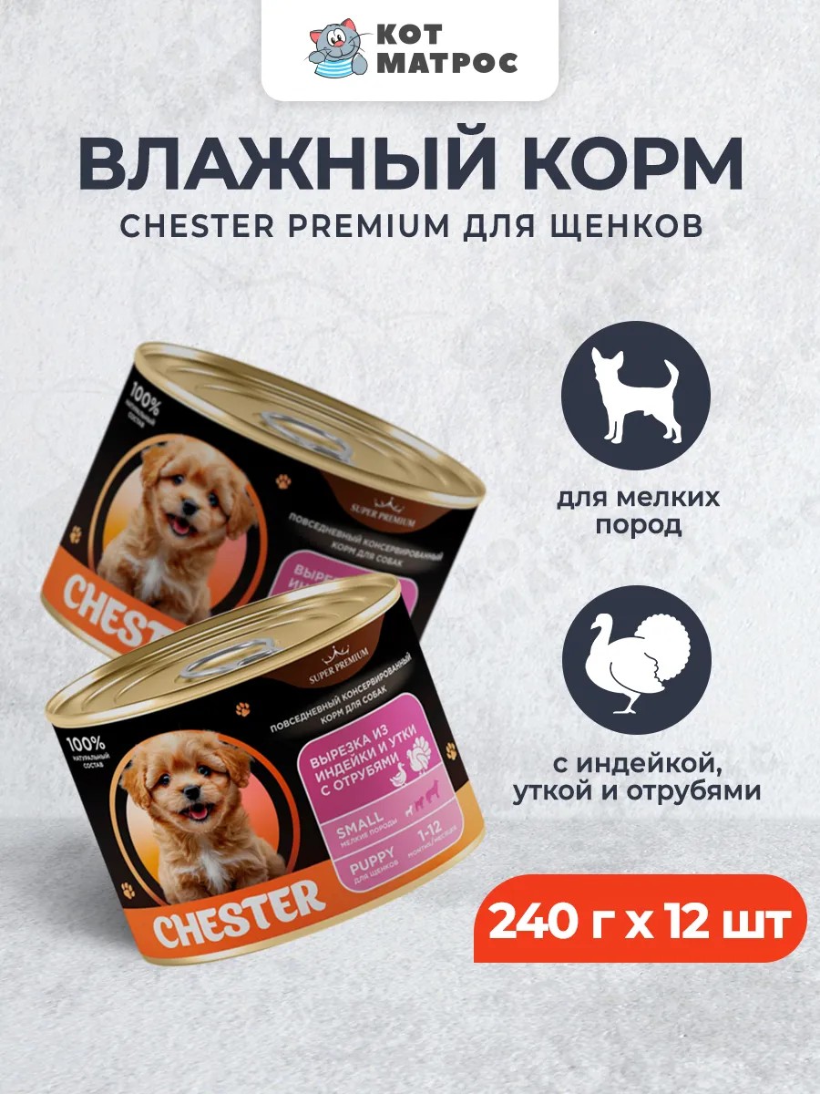 | Полное наименование товара | Chester Premium влажный корм для щенков мелких пород вырезка из индейки и утки с отрубями - 240 г х 12 шт |