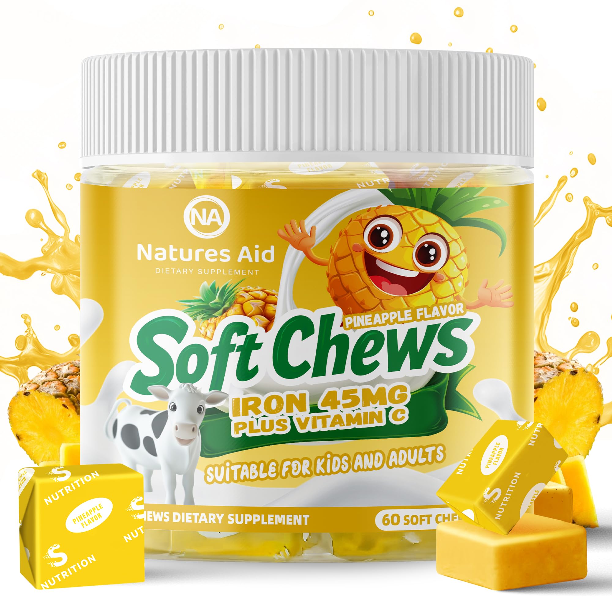 Formulated for Those Who Need Iron:Natures Aid's Iron supplement chews are a healthy delight for the entire family! Designed for those with common iron deficiencies such as pregnant women, children, menstruating girls, vegans, vegetarians, and anemic men or women— help fight fatigue, sharpen mental clarity, and maintain healthy energy levels, making them an ideal choice for enhancing overall vitality. Affordable: Each Bottle contains 60 Iron Soft Chews that will last most patients 60 days. Only one soft chew needed per day for most. Individually wrapped for on the go convenience. features a gummie like candy texture. Each chewy bite is also gluten free. Iron Vitamin C - Combining 45mg of elemental Iron 100mg of Vitamin C for max absorption rapid results and without the metallic taste of iron pills,Well-tolerated and bioavailable form of Iron. Vitamin C helps support Iron Absorption. Juicy Pineapple Flavor - Bursting with sweet cherry goodness, our individually wrapped iron chewables are your ticket to on-the-go wellness. The fusion iron supplement leaves taste buds dancing with delight, without a metallic aftertaste or indigestion. Irresistible Iron Supplements - Tackle iron deficiency and maintain optimal iron levels to elevate vitality with a daily delicious chewable iron supplement for women and men. Experience greater cell health, glowing skin, luscious hair strong nails.