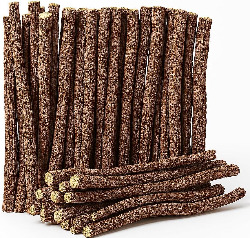 CAUTION FOR HIGH BLOOD PRESSURE - Liquorice yellow root may raise blood pressure in sensitive individuals. Do not overconsume if you have hypertension or are under related medical treatment. ? ?. SUSTAINABLE CONVENIENT - Packaged in a resealable bag for freshness, these mulethi liqorish toothbrush chew sticks are ideal for everyday use at home, work, big league or on the go. Plastic-free, eco-friendly, and miswak aligned with plant-based lifestyles. HELPS CURB HUNGER NICOTINE URGES - Traditionally used as an herbal remedy to suppress appetite and reduce cigarette cravings. A natural colored oral aid to help transition away from unhealthy habits organico. PROMOTES CLEAN TEETH FRESH BREATH - Gently cleanses teeth and gum with every chew while naturally freshening breath. The ancient sweet sap sewak released during chewing enhances oral fragrance and promotes lasting mouth freshness. PURE NATURAL LICORICE ROOT - Made from 100 Glycyrrhiza Glabra wack with no added flavors or sweeteners. These raw, sun dried chew sticks are a traditional herbal tool for oral hygiene, fresh breather, and appetite control.