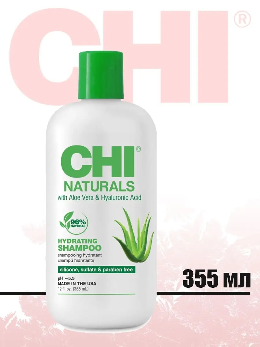 Мягкий бессульфатный шампунь Чи для всех типов волос с Алоэ Вера и Гиалуроновой кислотой, CHI Naturals With Aloe Vera Hydrating Shampoo 355мл. Помогает уменьшить сухость, повреждения и ломкость волос, усиливая блеск. Идеально подходит для ежедневного использования, без сульфатов, безопасен для цвета и сбалансирован по pH для всех типов волос. Обеспечивает оптимальное увлажнение для восстановления и баланса влаги. Мягко очищает, для ежедневного использования. Уменьшает сухость, повреждения и ломкость. Способ применения: Нанести небольшое количество на волосы, вспенить, оставить на 2 минуты, затем тщательно смыть.