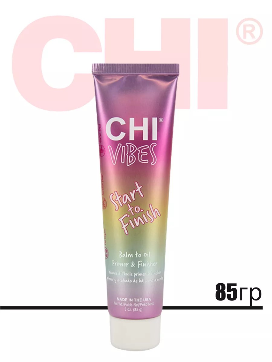 CHI VIBES Start to Finish. Balm to Oil - выпрямительное средство для волос с термозащитой, 85гр. Используйте этот продукт от начала до конца, чтобы подготовить волосы к сушке феном и придать им идеальную гладкость. Обеспечивает термозащитц для предотвращения теплового повреждения и ломки волос. Также работает в качестве завершающего средства, чтобы укротить пушистость, разгладить вьющиеся волосы и придать блеск. Идеально подходит для всех типов волос. Активные компоненты: сквалан, пантенол, масло семян жожоба. Способ применения: Разотрите небольшое количество между руками, чтобы получить маслянистую консистенцию. На влажные волосы нанесите на всю длину волос и высушите феном для разглаживания. На сухие волосы нанесите там, где это необходимо, чтобы укротить выпадение волос и придать им блеск.