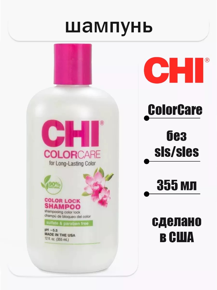 CHI COLORCARE COLOR LOCK SHAMPOO Шампунь для окрашенных волос 355 мл. CHI COLORCARE – идеальное решение для окрашенных волос! Наш шампунь специально разработан на основе натуральных ингредиентов, чтобы обеспечить бережный уход за вашими волосами. Благодаря уникальной смеси алоэ вера, протеина шелка, VibraRiche и комбинации экстрактов бамбука и крыжовника наш шампунь предназначен для фиксации цвета, восстановления влаги и балансировки естественного уровня pH ваших волос.