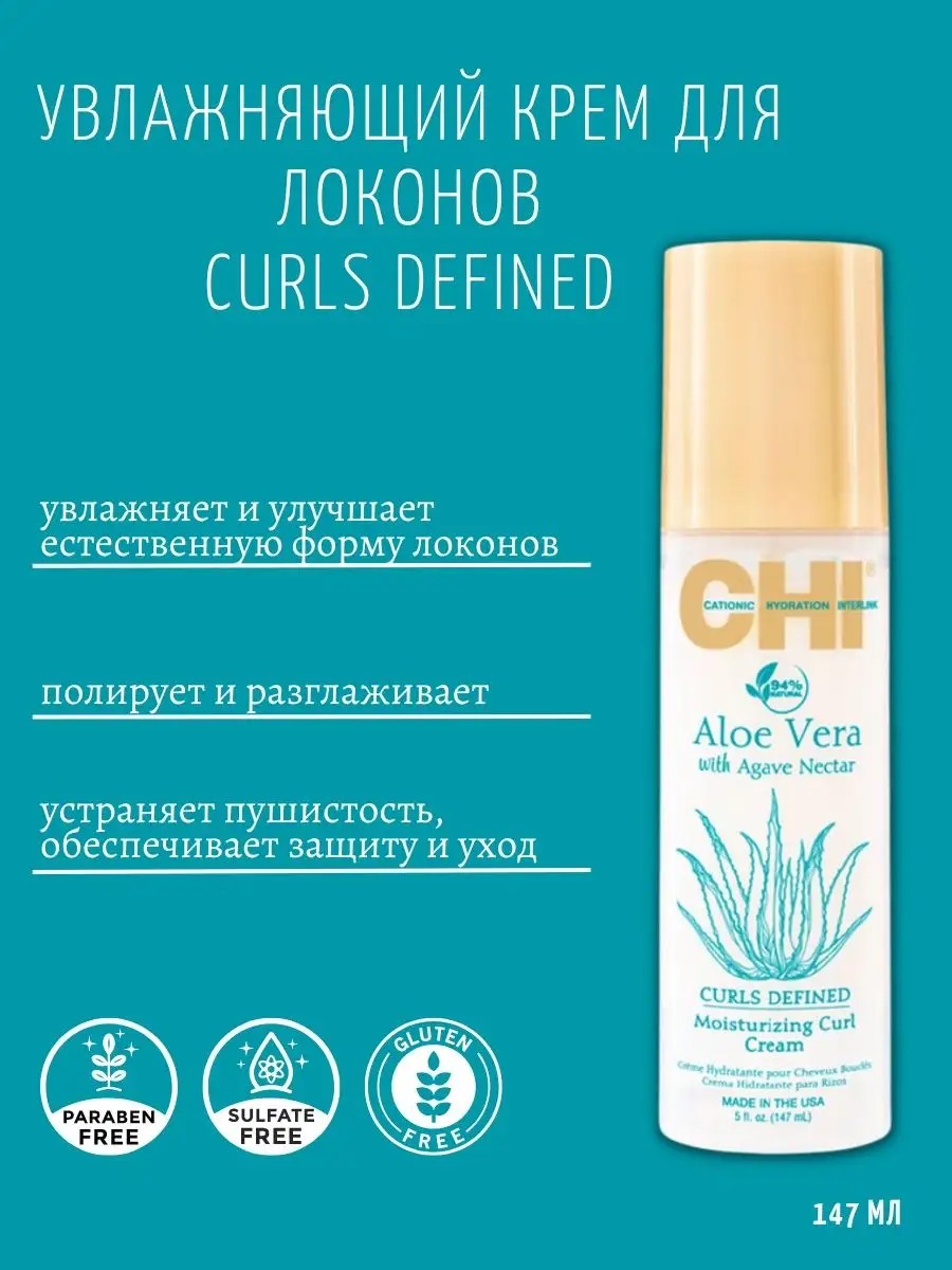 CHI Aloe Vera Moisturizing Curl Cream интенсивный невесомый увлажняющий крем для вьющихся волос интенсивно увлажняет кудрявые волосы, разглаживает неровности, устраняет пушистость.Полностью обволакивает волос, обеспечивает защиту и дополнительный уход. Устраняет эффект скомканных волос даже при влажной погоде! Крем-маска обладает выраженным кондиционирующим действием, что особенно важно для жестких, пористых, вьющихся и кудрявых волос. Может использоваться как на влажные, так и на сухие волосы. Средство быстро впитывается, не оставляя на волосах жирных и липких следов.