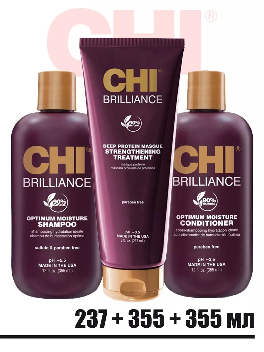 Набор из шампуня, бальзама и маски для поврежденных волос CHI DEEP BRILLIANCE. Шампунь 355мл + Кондиционер 355мл + Маска 237мл.