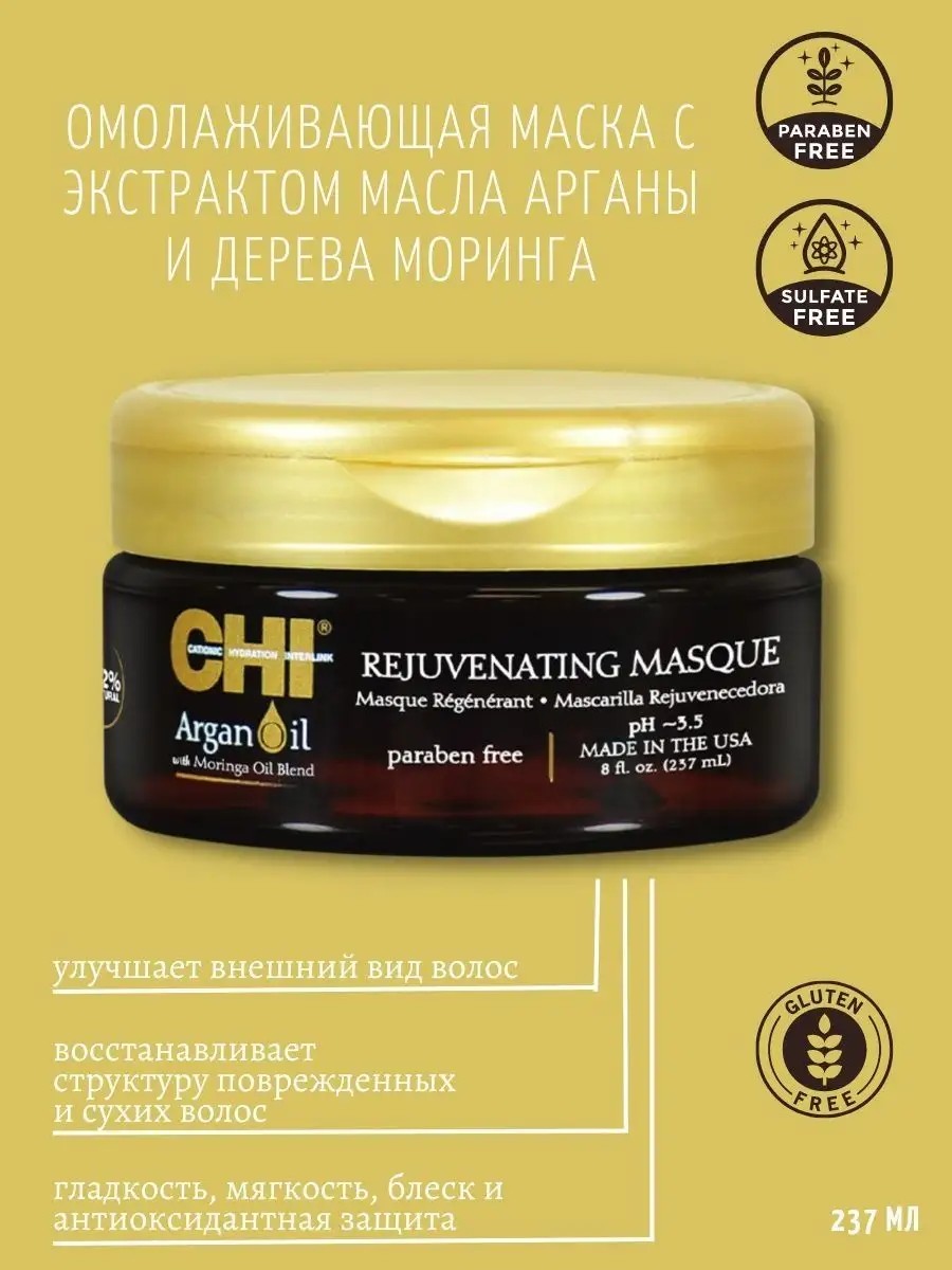 Омолаживающая маска CHI масло Аргана: Глубоко питает и наполняет волосы необходимыми витаминами и антиоксидантами, которые пополняют влагу, восстанавливают блеск, разглаживают волосы, делая общий вид волос превосходным.Маска CHI Argan Oil придает волосам здоровый вид, разглаживает волос и восстанавливает блеск. Обеспечивает питание поврежденных волос.После применения шампуня CHI Argan Oil густо нанести маску. Мягкими массирующими движениями распределить по всей длине волос и оставить на 5 минут. Добавить немного теплой воды, чтобы разбавить маску, затем смыть.